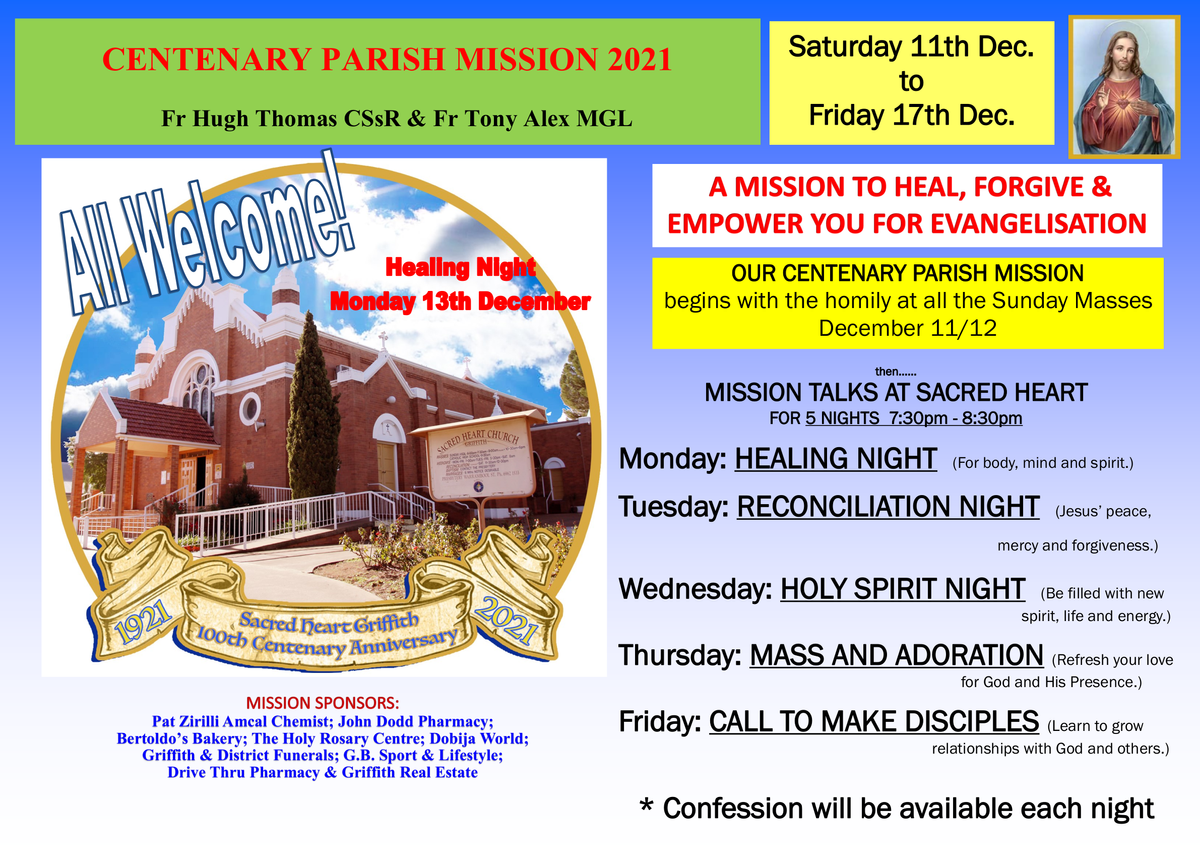On the second week of December (13th- 17th) Sacred Heart Parish will prepare all the faithful for the celebration of Parish Centenary and Christmas through the special Parish Mission. Everyone is welcome to join this Parish Mission. The time for confession and special healing prayer will be available for everyone.