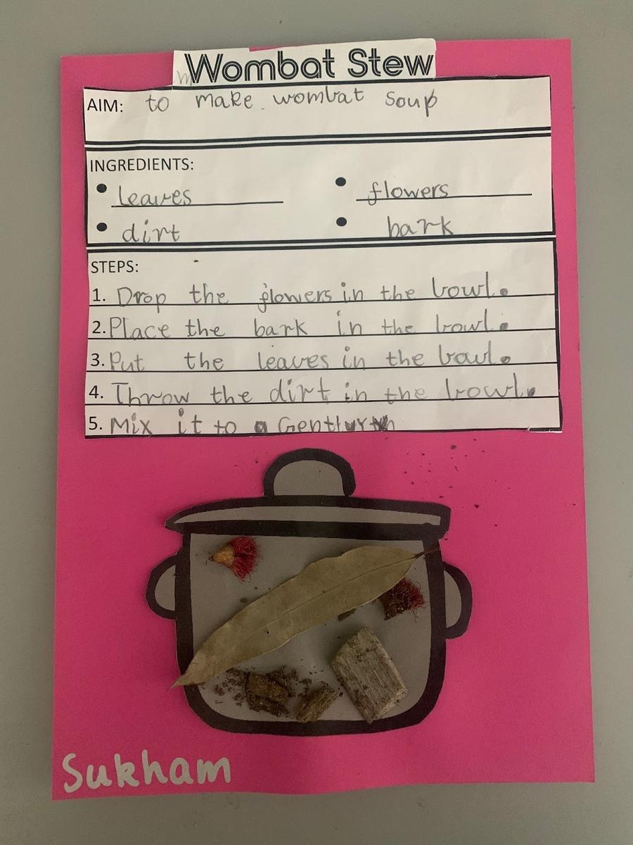 Students read Wombat Soup, and reinvented the story by making their own procedure of Wombat Soup using items they found around the school. This week students also created slime and wrote a procedure on how to make it.
