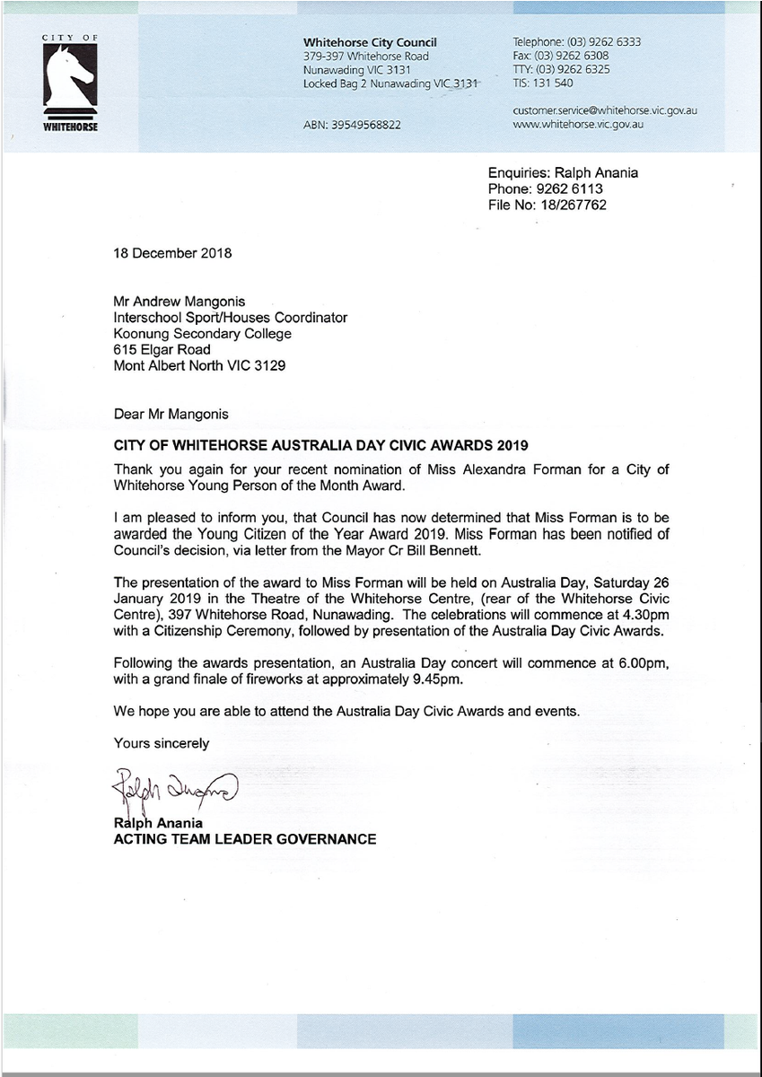 Congratulations to Year 12 student Alexandra Forman who has been announced as the recipient of (and deservedly so) the Young Citizen of the Year Award 2019 by the Whitehorse City Council.