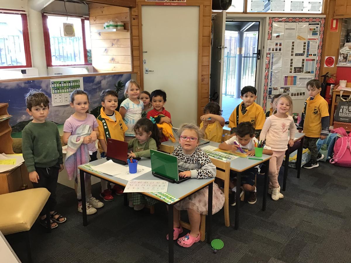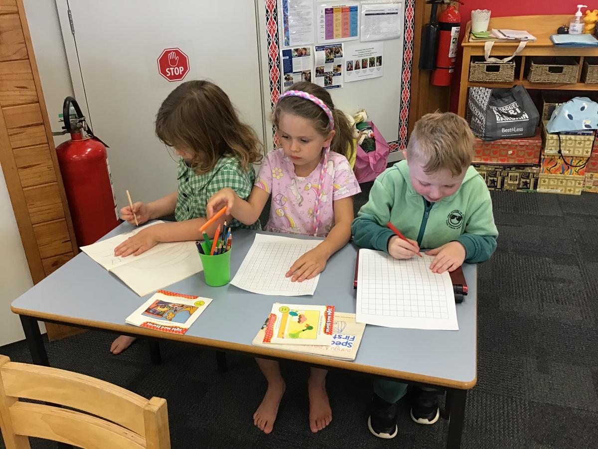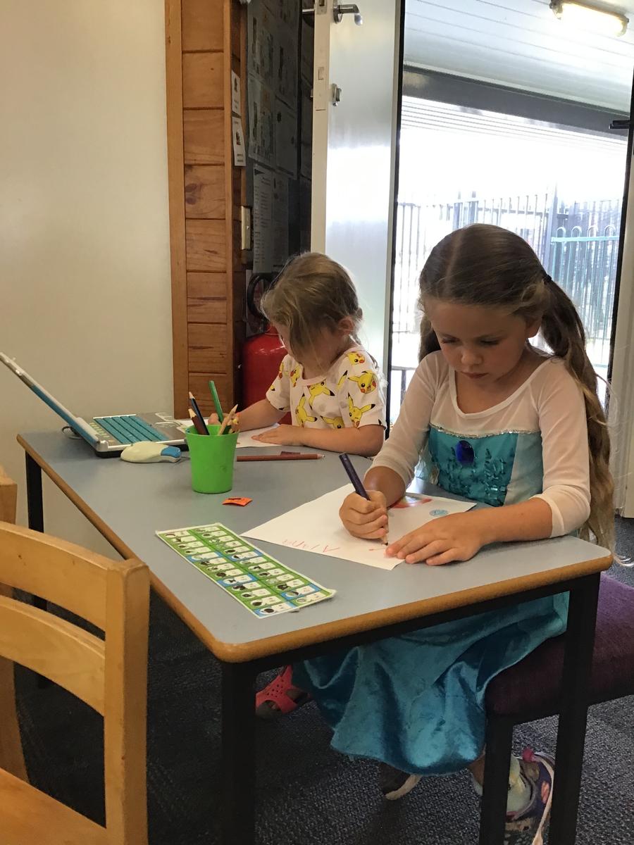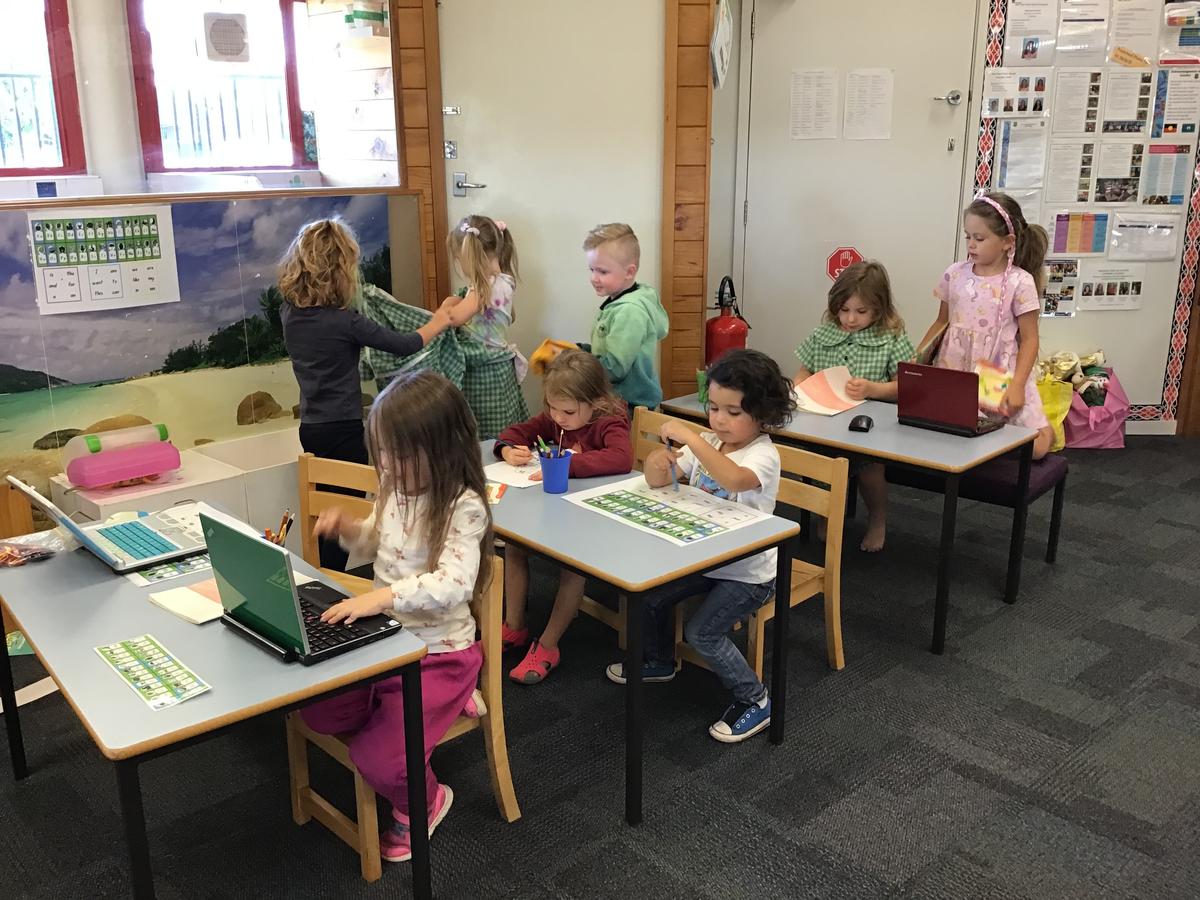Part of Preschool has become a pretend school classroom. The most popular roles for the children are the Principal and Teacher. We hear lots of interesting conversations as the children imagine what happens in a classroom. The children enjoy putting on the school uniform and completing "schoolwork". Oakie dokies are regularly handed out and some of the children have quite a collection. Dramatic play in a pretend school is part of our transition activities. It helps to dispel preconceived ideas and anxieties about school.