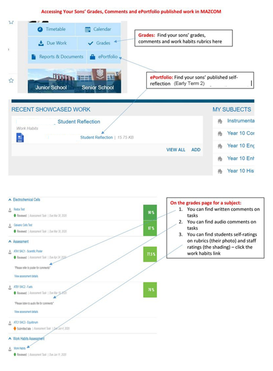 They complete the work habits rubric in all classes. Early in Term 2, all students will complete a self-reflection on their work and progress in Term 1 and a goal setting exercise for Term 2. Their written reflection and goals will be published by the students to their ePortfolio on MAZCOM, where it is viewable by parents.