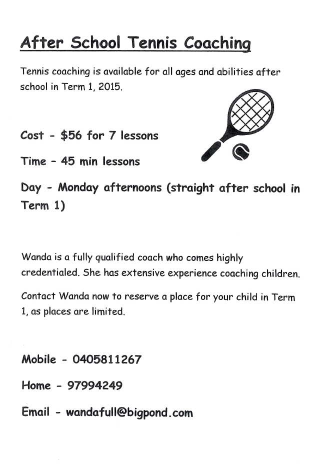 Tennis Lessons run after school on a Monday Night.