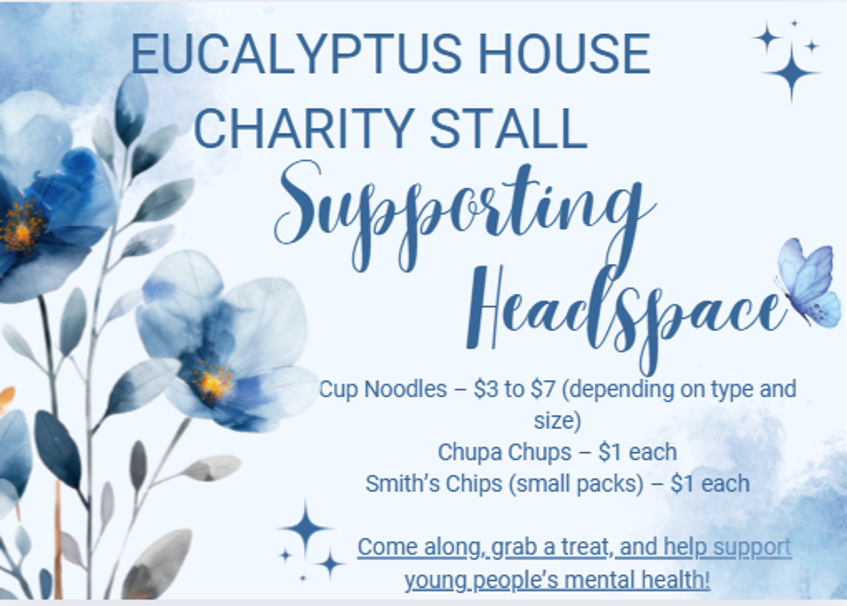 This term, Eucalyptus SRCs has been busy with fundraising, student wellbeing, and making sure everyone feels supported. We’ve been running lunchtime stalls selling cup noodles, lollipops, and chips. The money raised goes towards Headspace, an organisation that supports young people’s mental health. Supporting wellbeing is important to us because school is not just about studying, but also about feeling safe, included, and cared for.