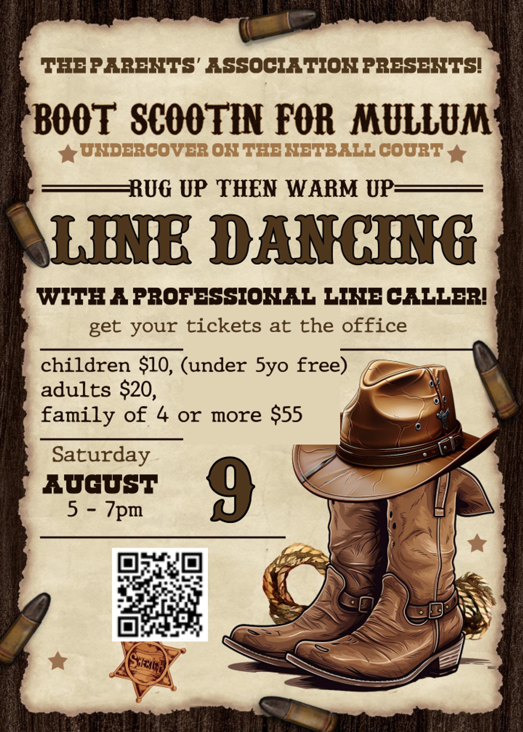 Everyone is invited to the "Boot Scootin for Mullum" Night on Saturday 9 August. Students have been practicing their line-dancing skills. A professional line caller will take us through the steps and teach us how to do the dance moves. This event is set to get your feet tapping and everyone joining in on the fun. This is one of the major fundraising events on the Parents' Association calendar and we look forward to having our whole community there. Contact the office for tickets.