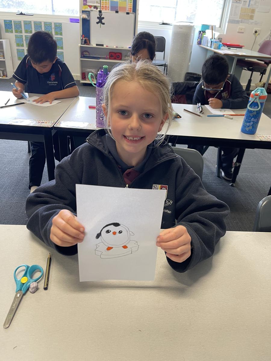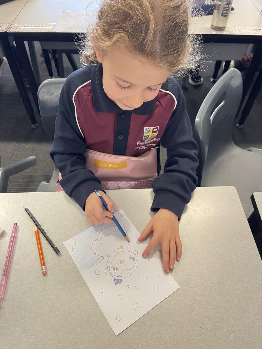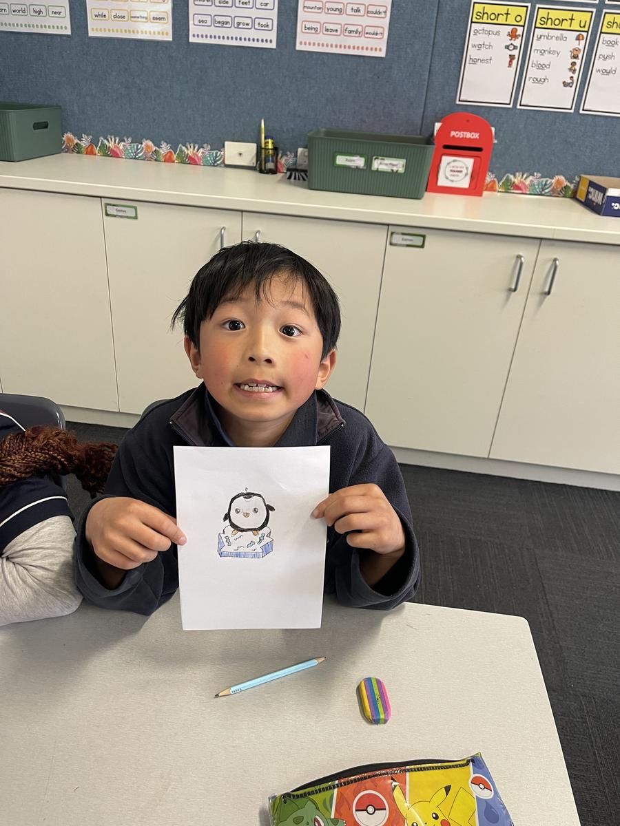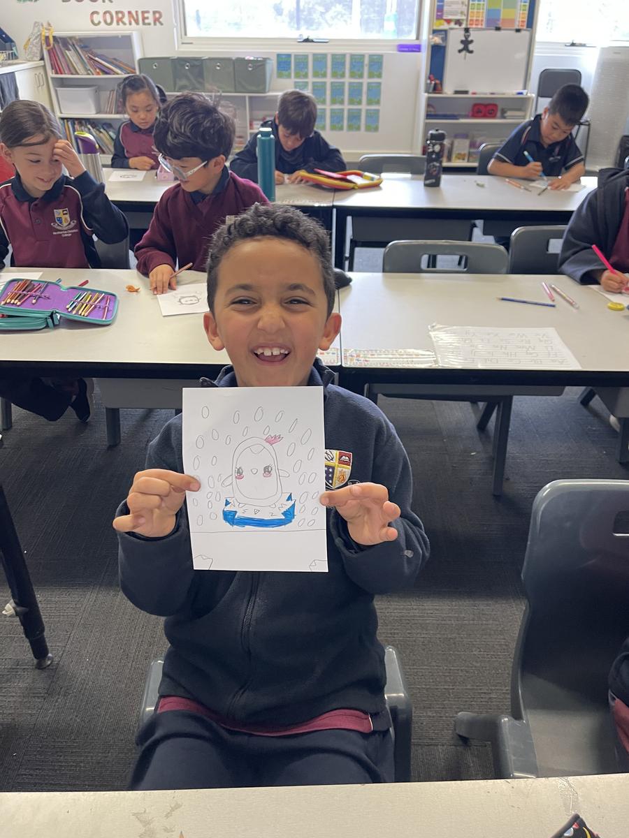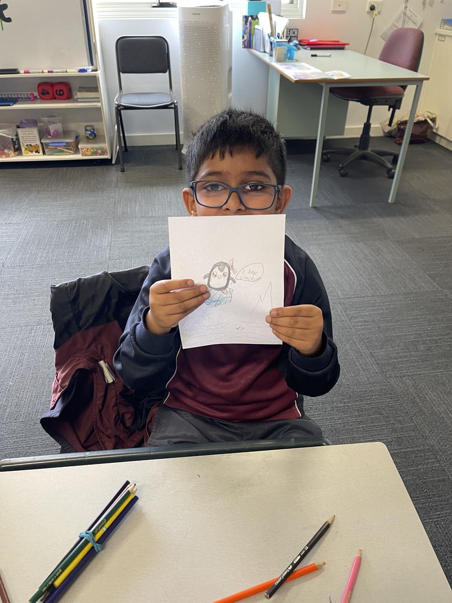 Mrs Rose read Jonty Gentoo by Julia Donaldson with Grade 1s and 2s, sparking conversations about kindness, followed by guided drawings and recount writing.
