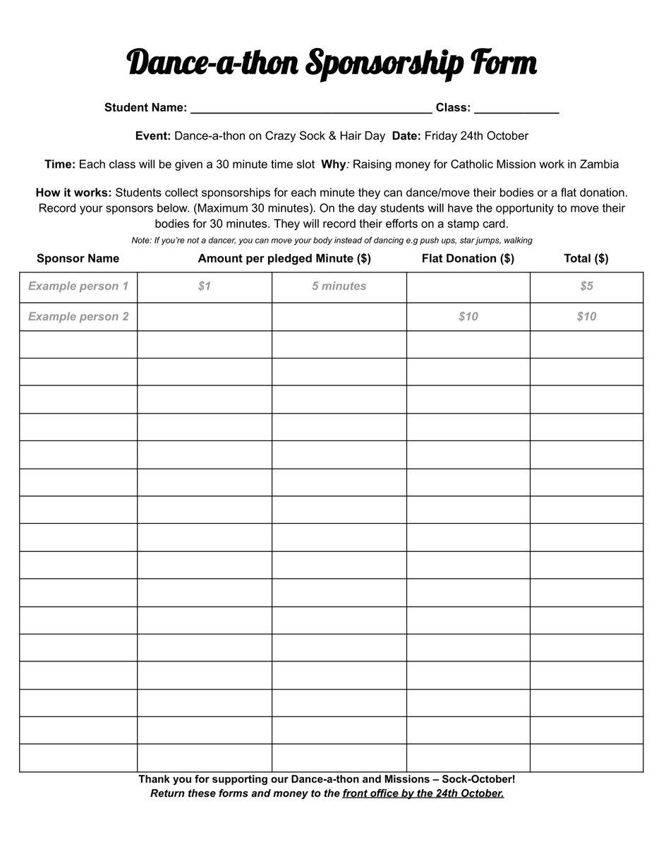 Each class will have a 30-minute time slot in the hall to dance, move, and have fun while collecting sponsorship from family and friends. Students will receive a stamp card to track their progress, and of course, they are encouraged to wear their craziest socks and wackiest hair!