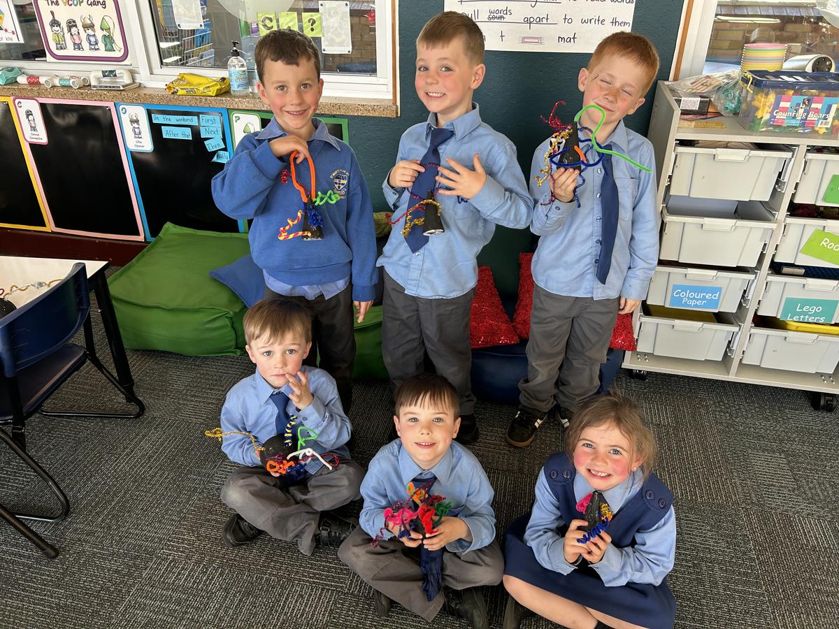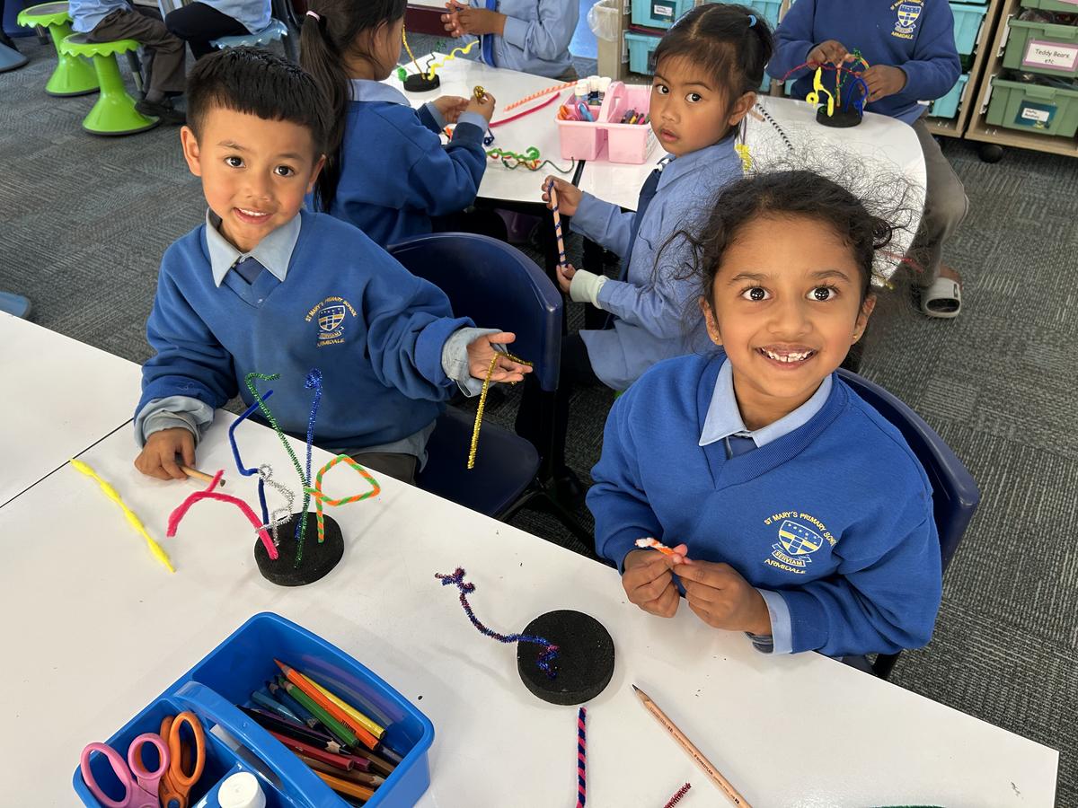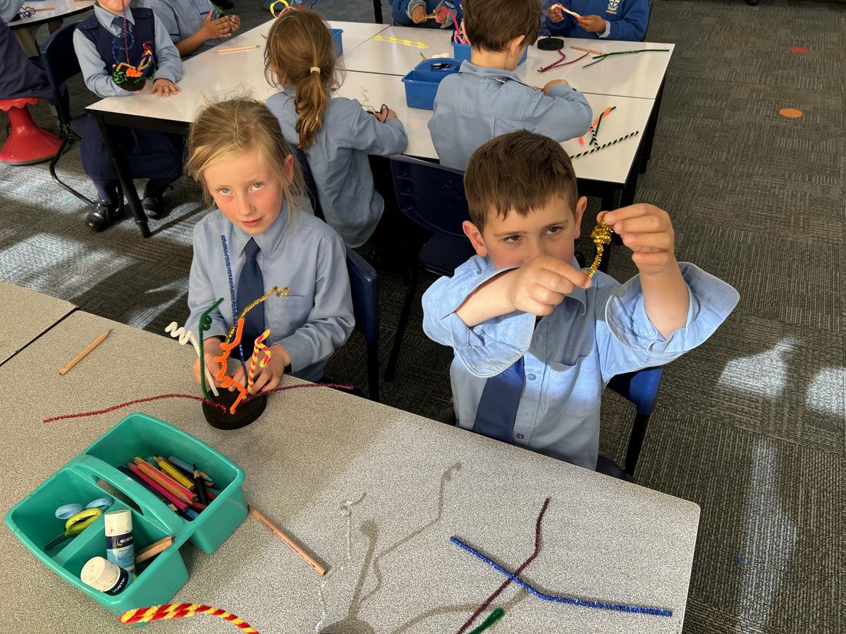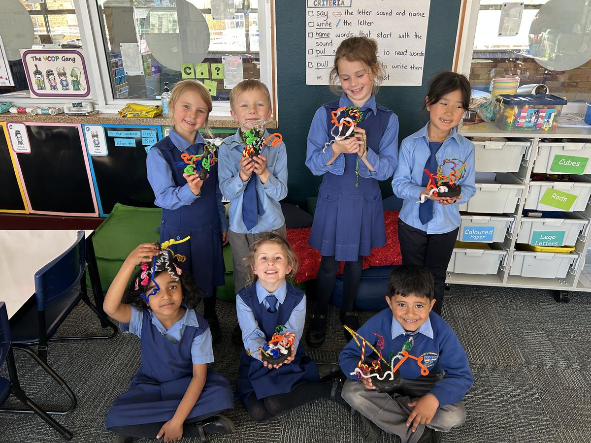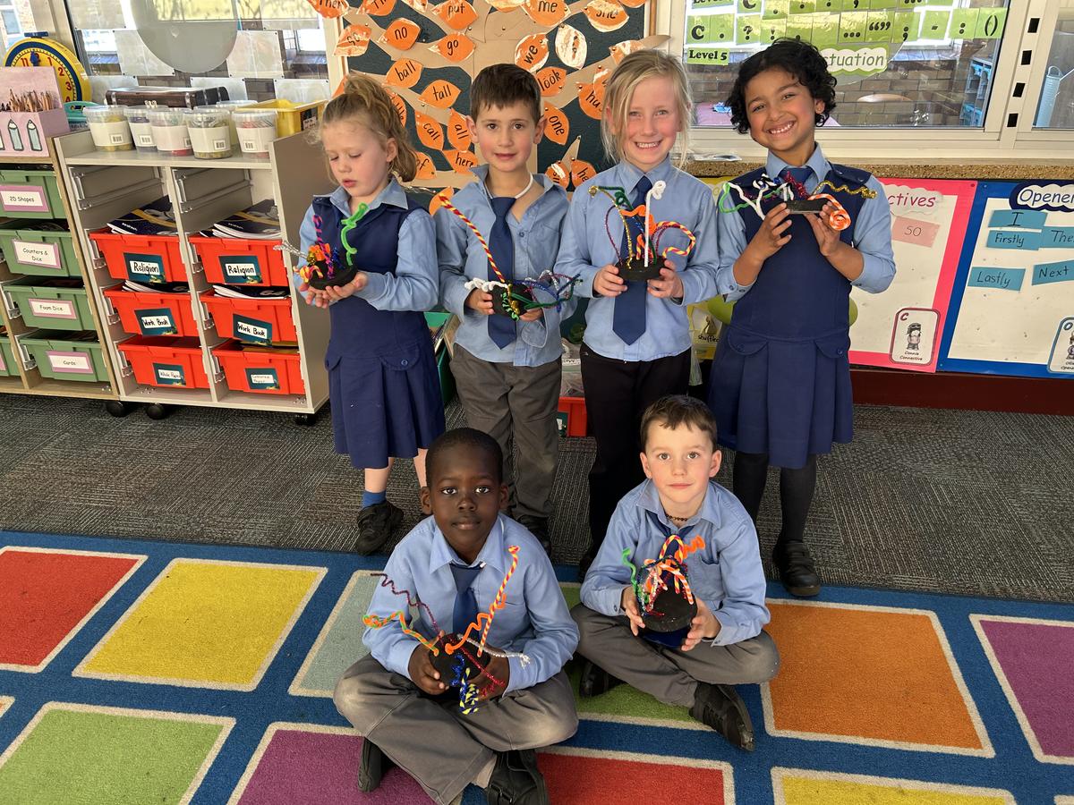 To conclude our learning about line, colour and shapes in Visual Arts the children enjoyed making sculptures of fireworks. They twisted and bent a variety of coloured and patterned pipe cleaners to represent fireworks. These were then pushed into a piece of styrofoam which had been painted black like the night sky.