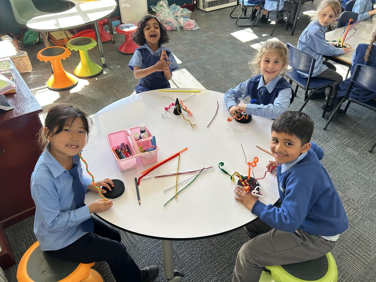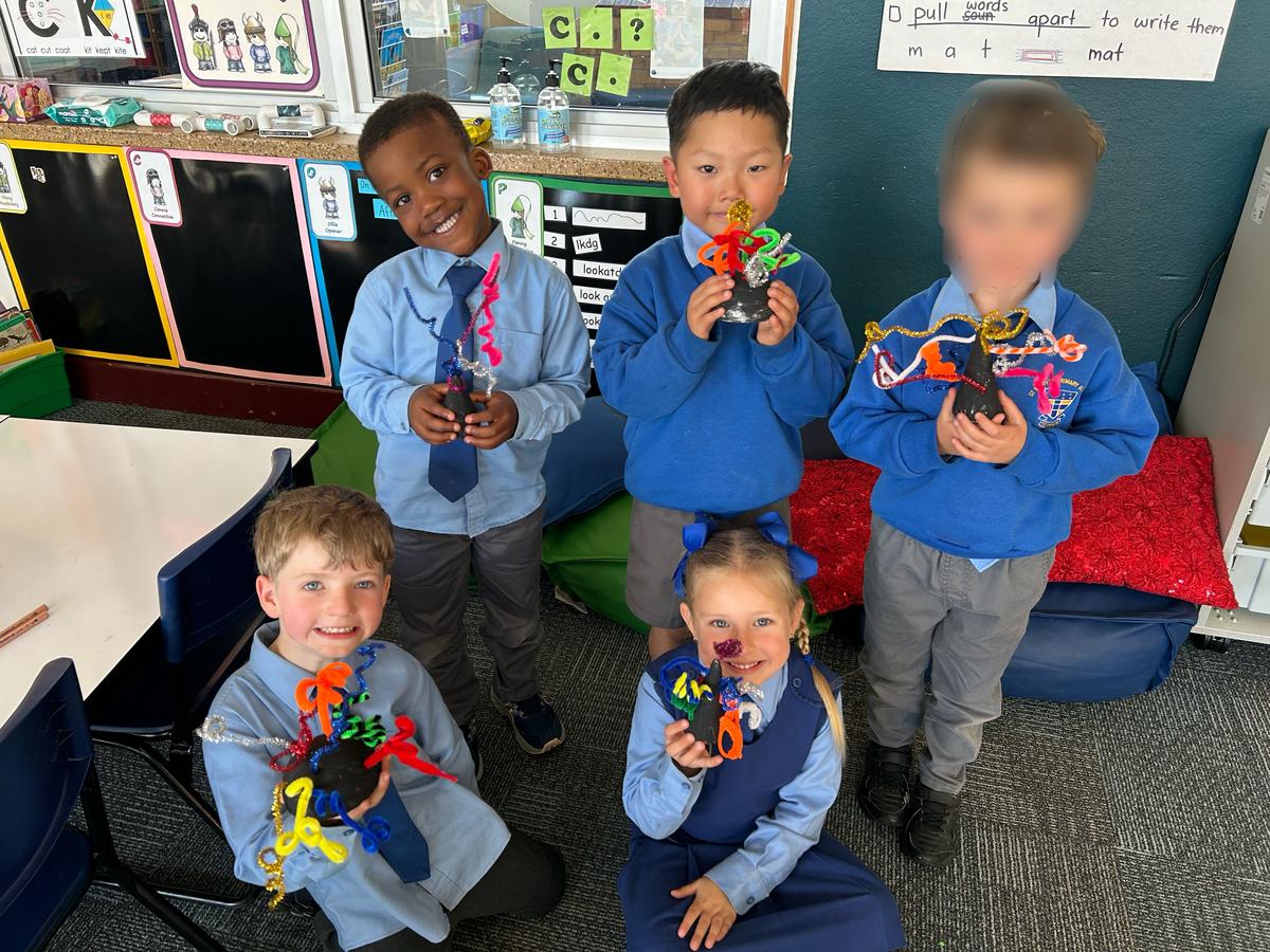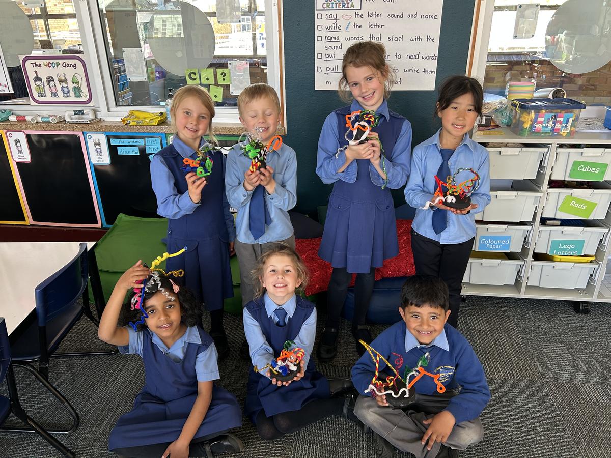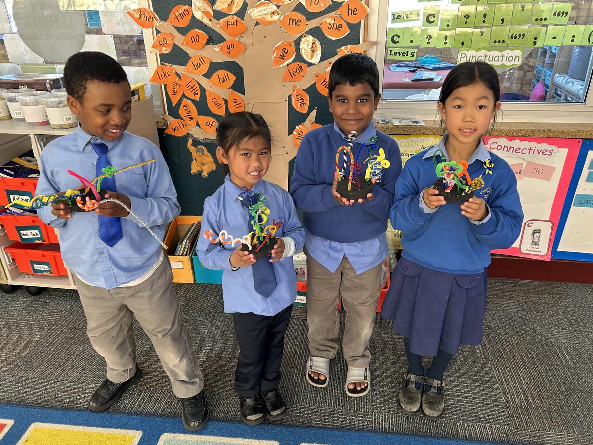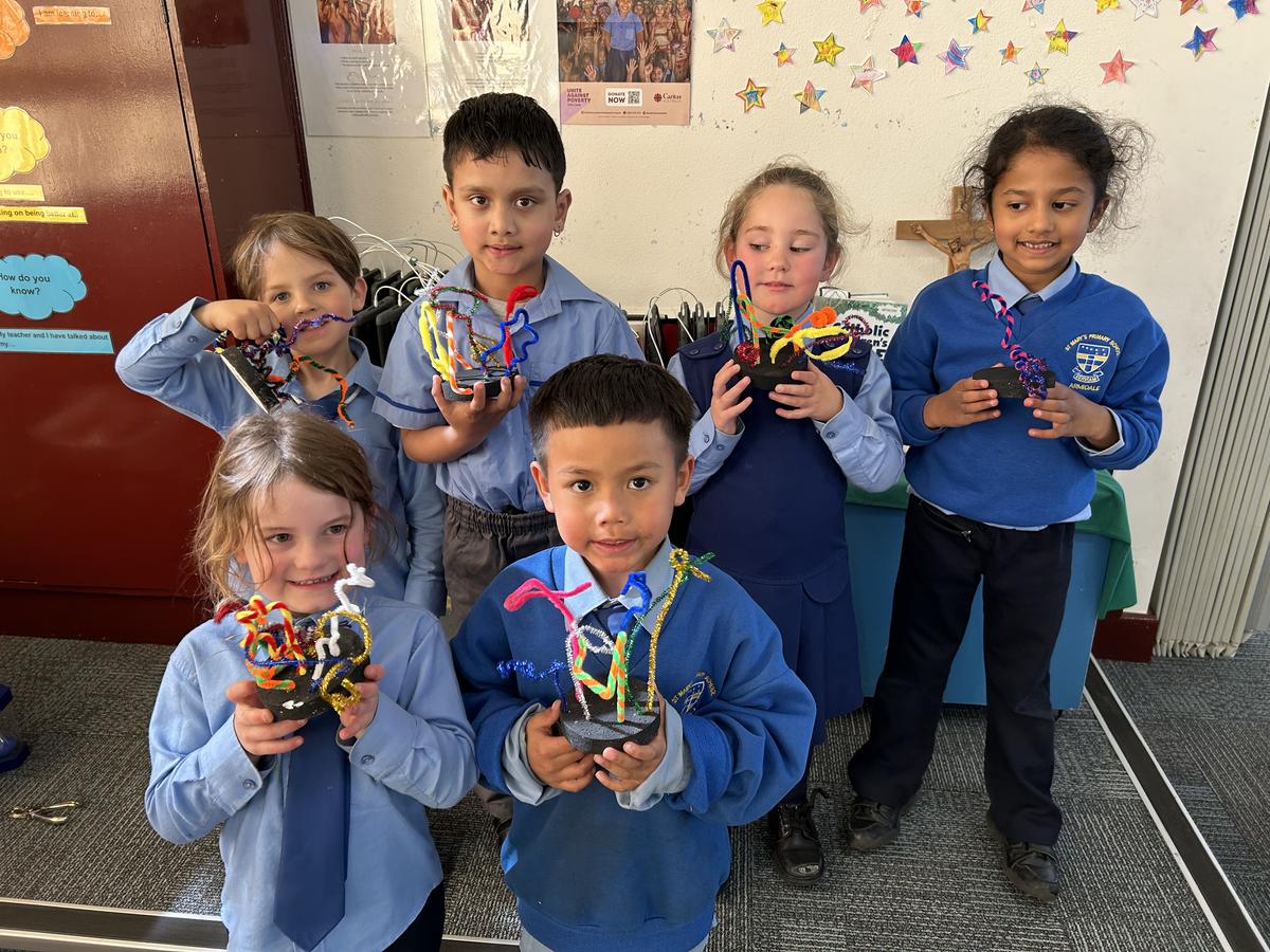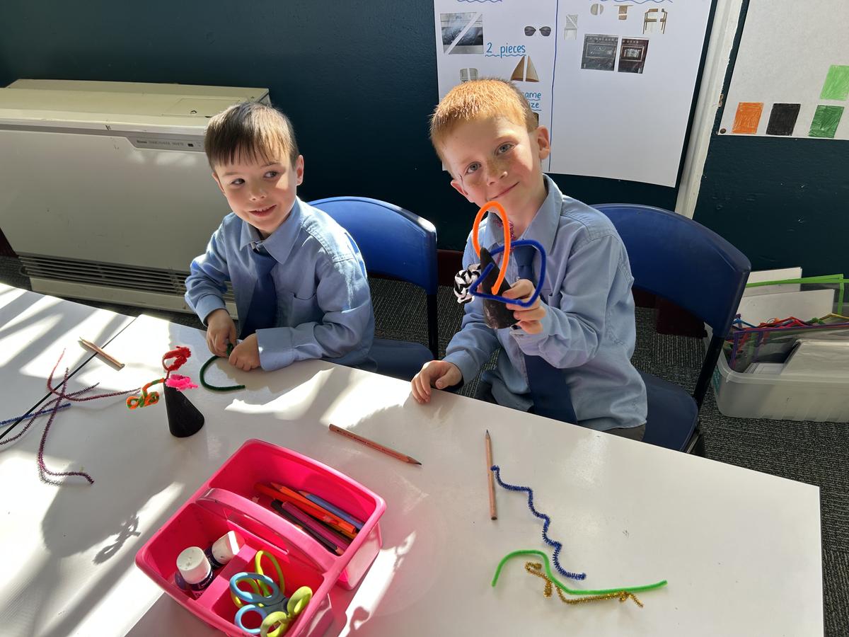 To conclude our learning about line, colour and shapes in Visual Arts the children enjoyed making sculptures of fireworks. They twisted and bent a variety of coloured and patterned pipe cleaners to represent fireworks. These were then pushed into a piece of styrofoam which had been painted black like the night sky.