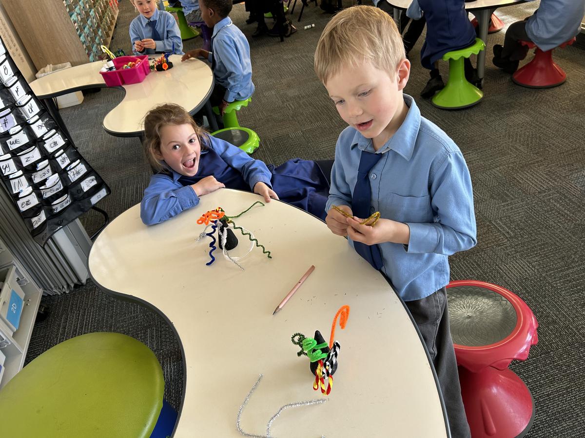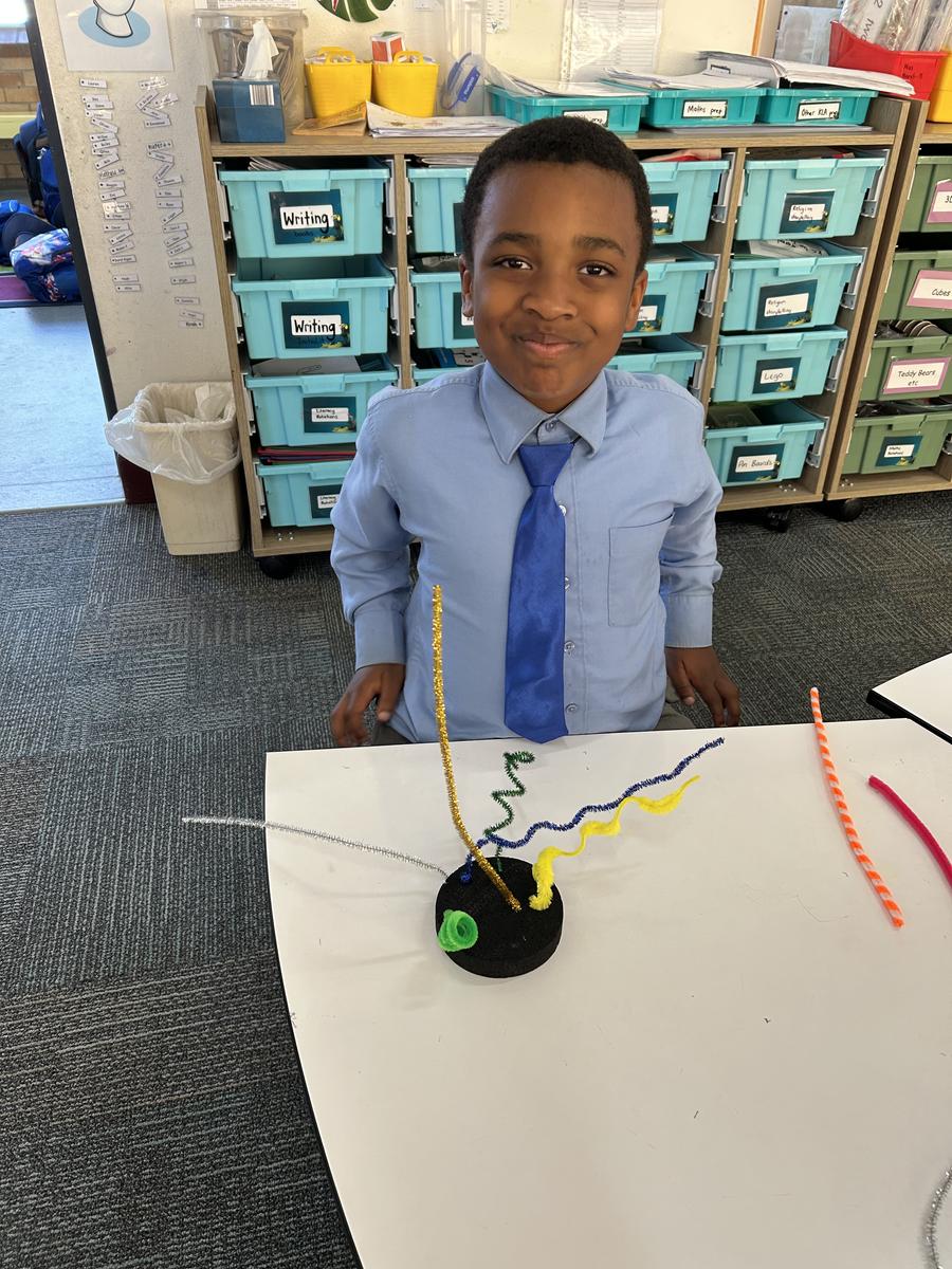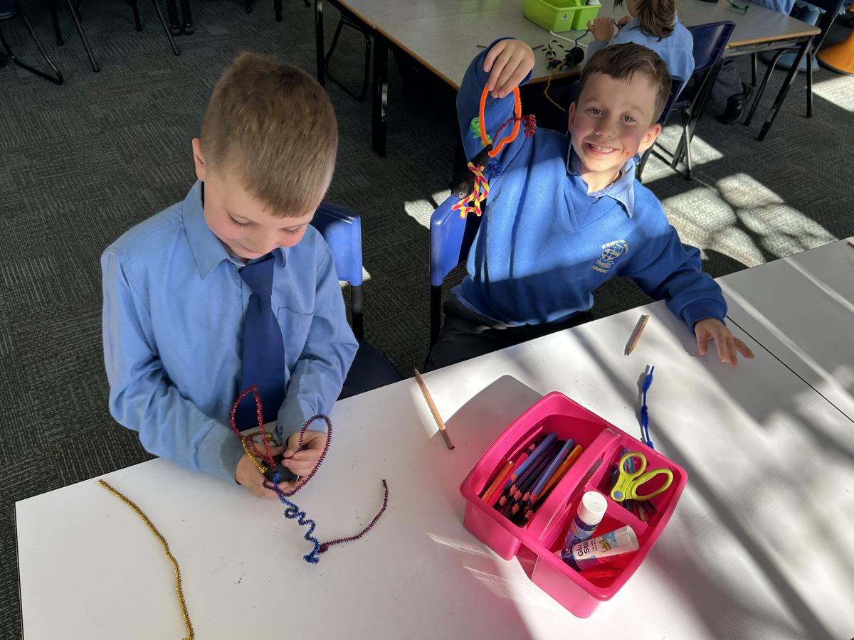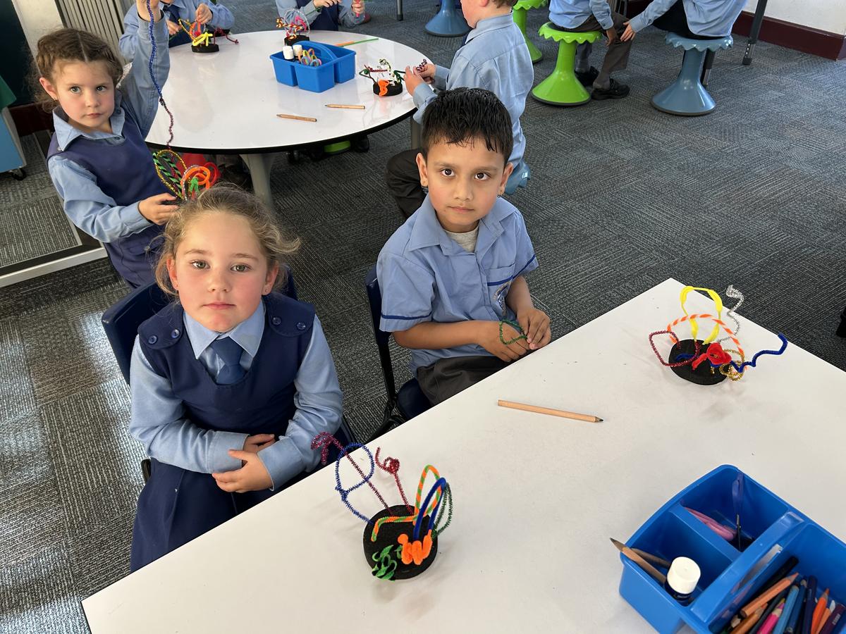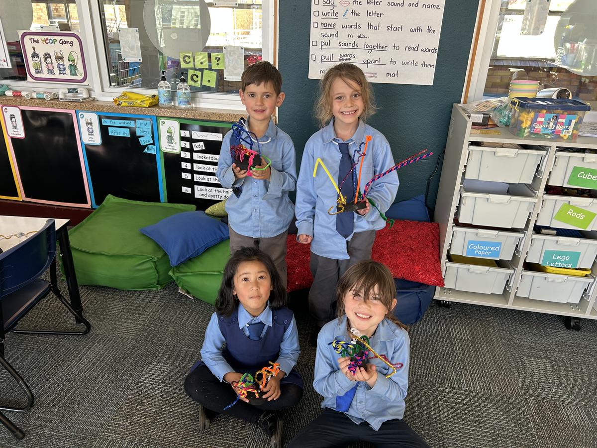 To conclude our learning about line, colour and shapes in Visual Arts the children enjoyed making sculptures of fireworks. They twisted and bent a variety of coloured and patterned pipe cleaners to represent fireworks. These were then pushed into a piece of styrofoam which had been painted black like the night sky.