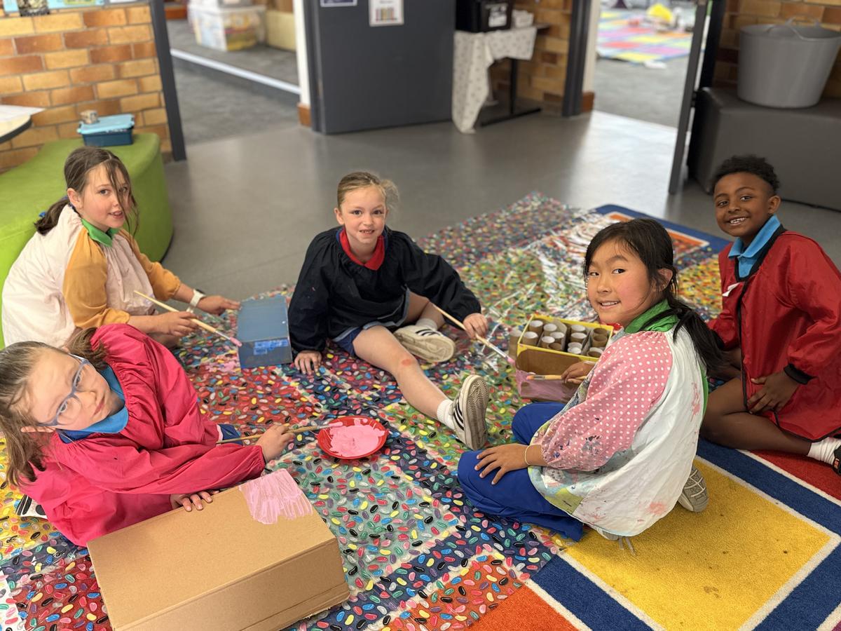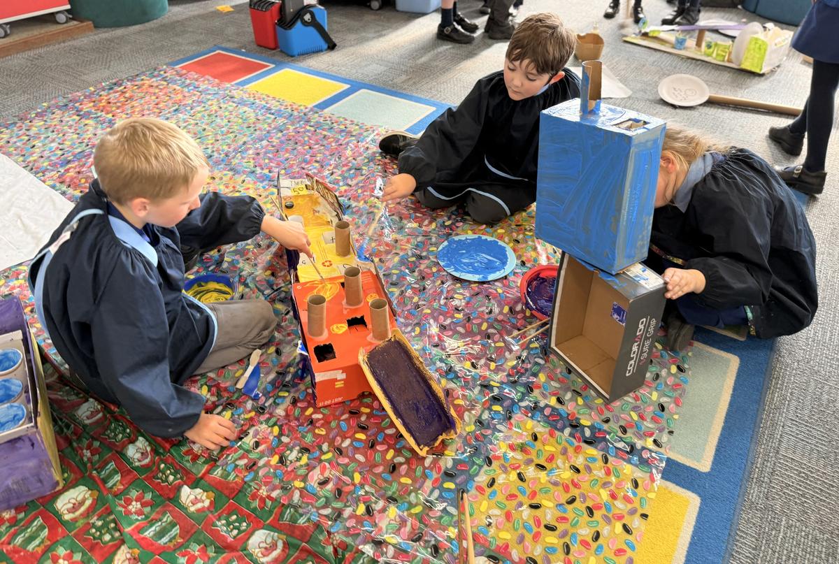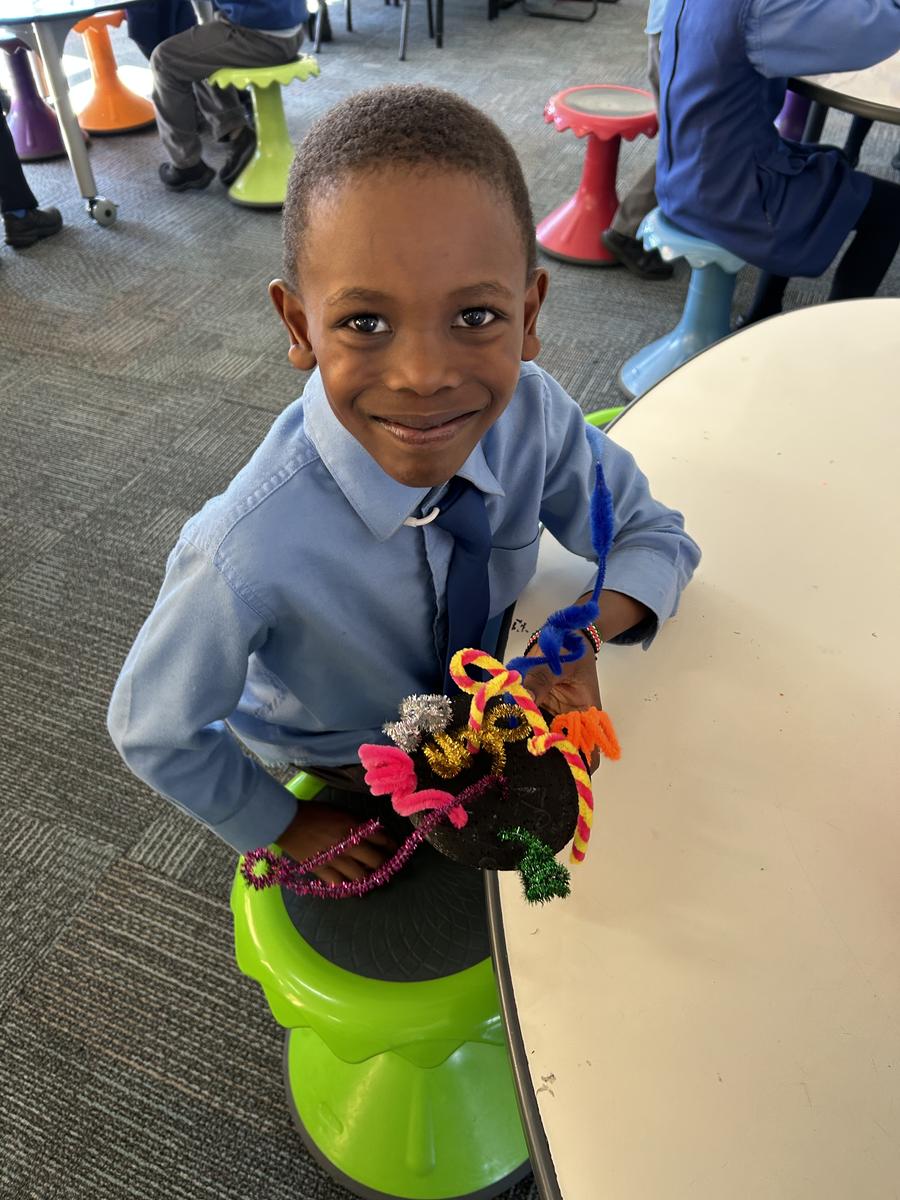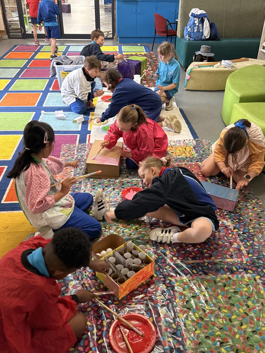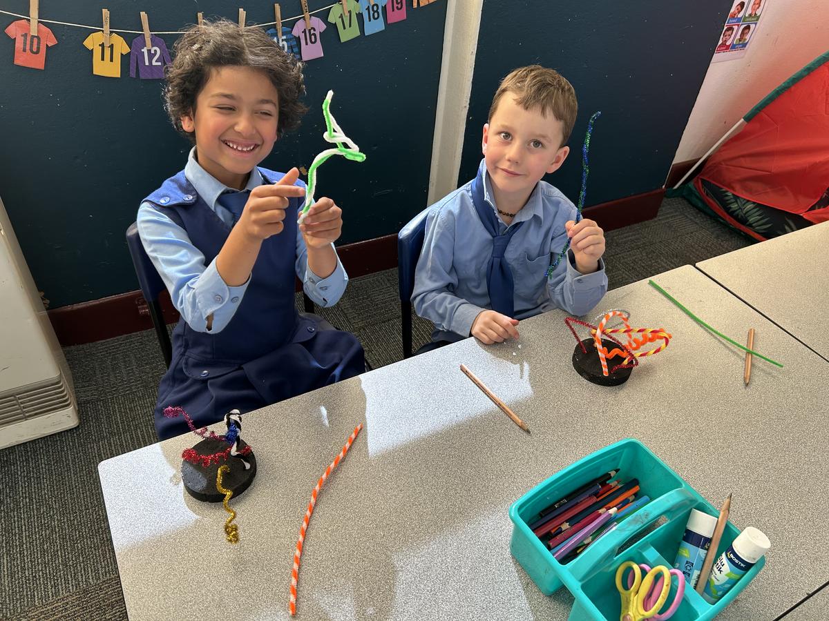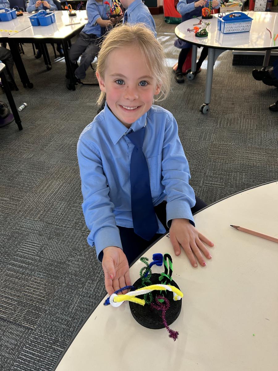 To conclude our learning about line, colour and shapes in Visual Arts the children enjoyed making sculptures of fireworks. They twisted and bent a variety of coloured and patterned pipe cleaners to represent fireworks. These were then pushed into a piece of styrofoam which had been painted black like the night sky.