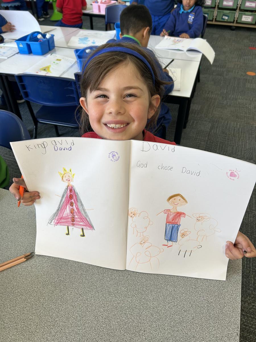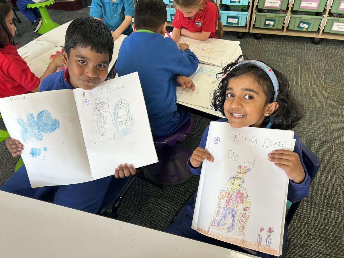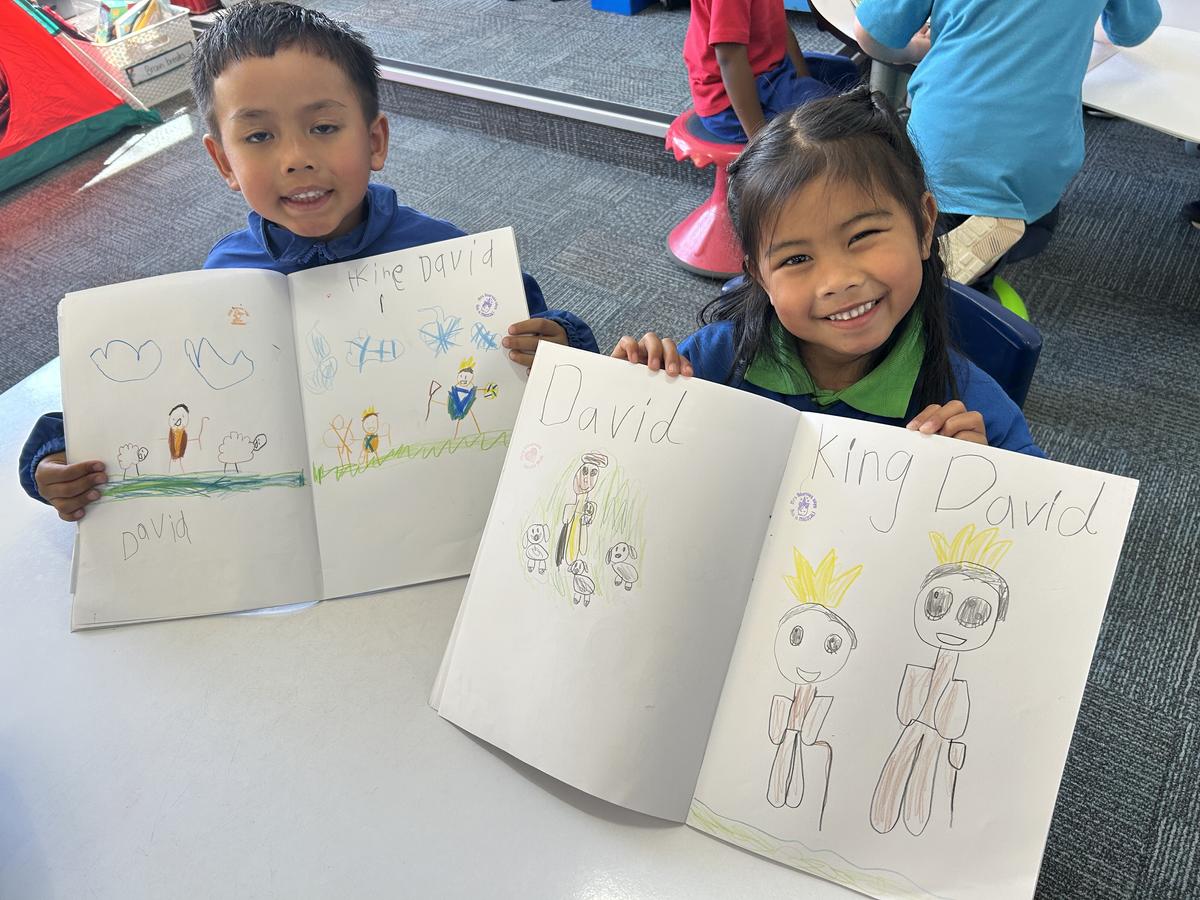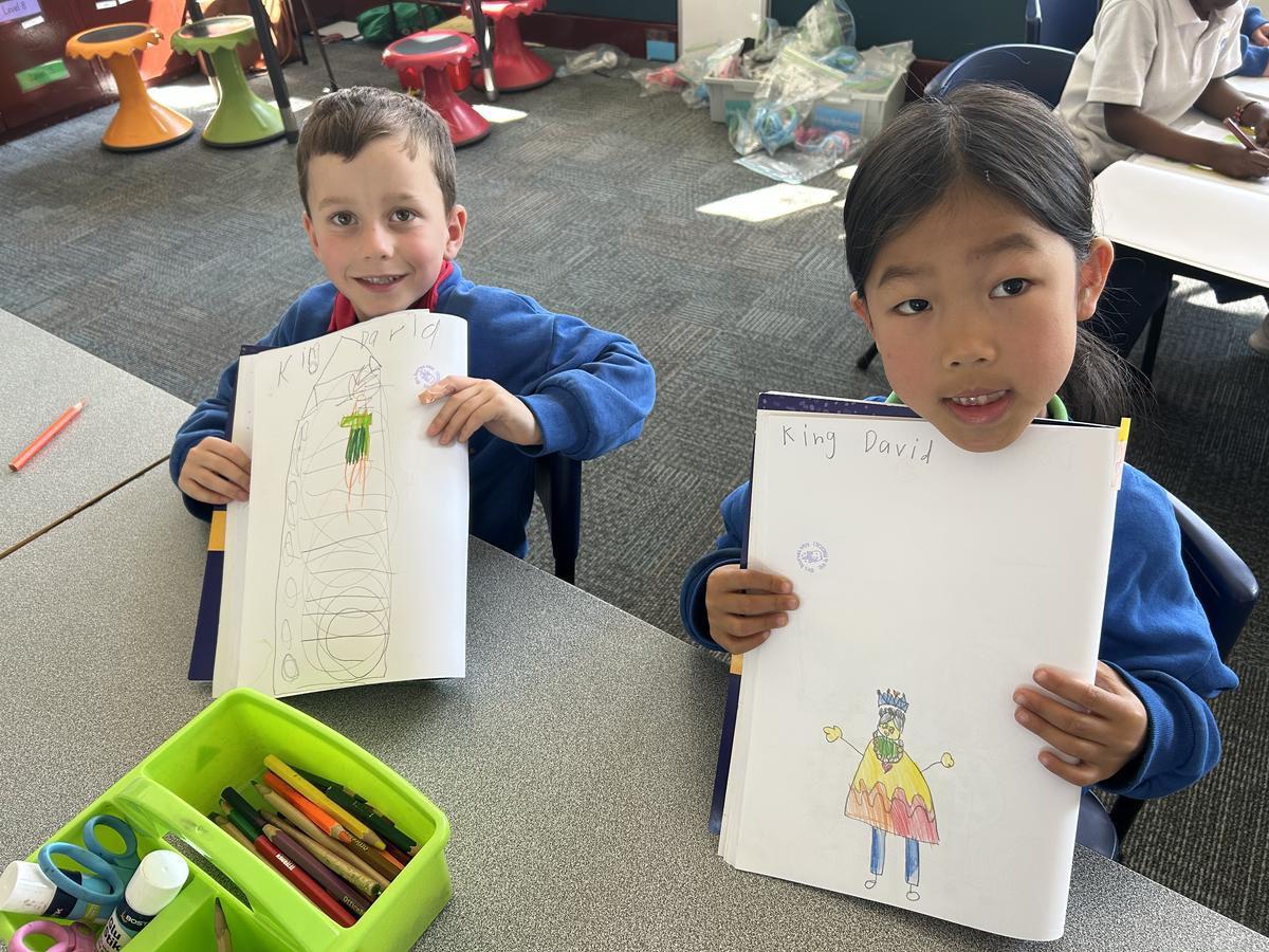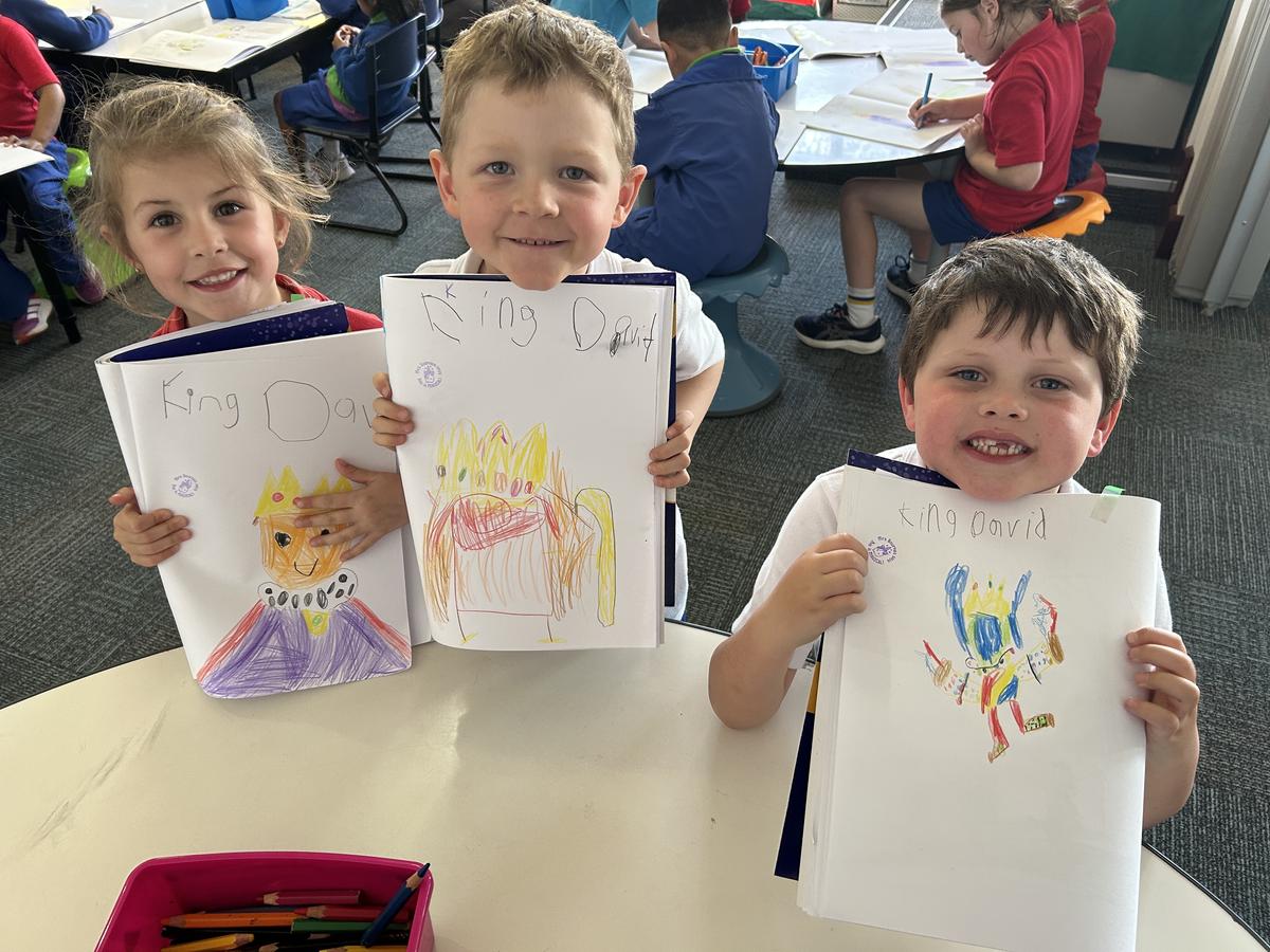 In Religion, Kindergarten have been learning about the stories of Moses' birth and King David from the Old Testament. They enjoyed retelling the story of Moses' birth using a storymap and cut out of baby Moses stuck to a paddlepop stick and hearing how David was brave enough to fight Goliath because he had God by his side to protect him. The children drew pictures of David as a shepherd (before he was annointed) and then as King of the Israelites.