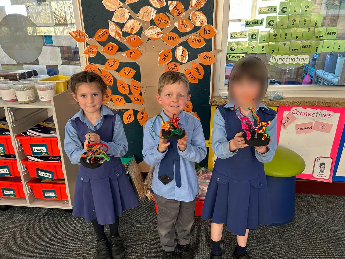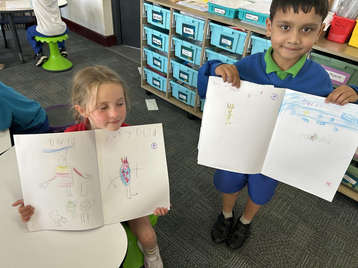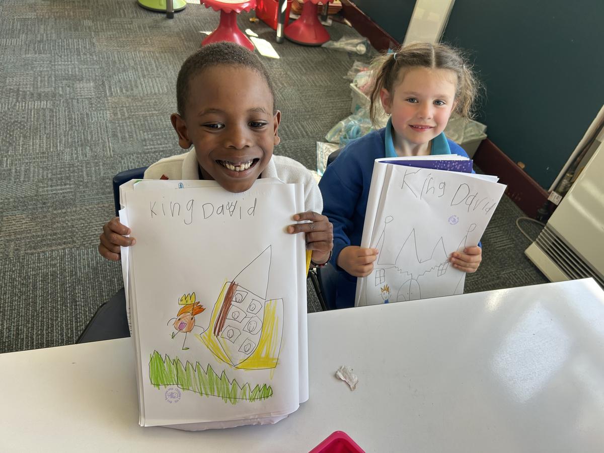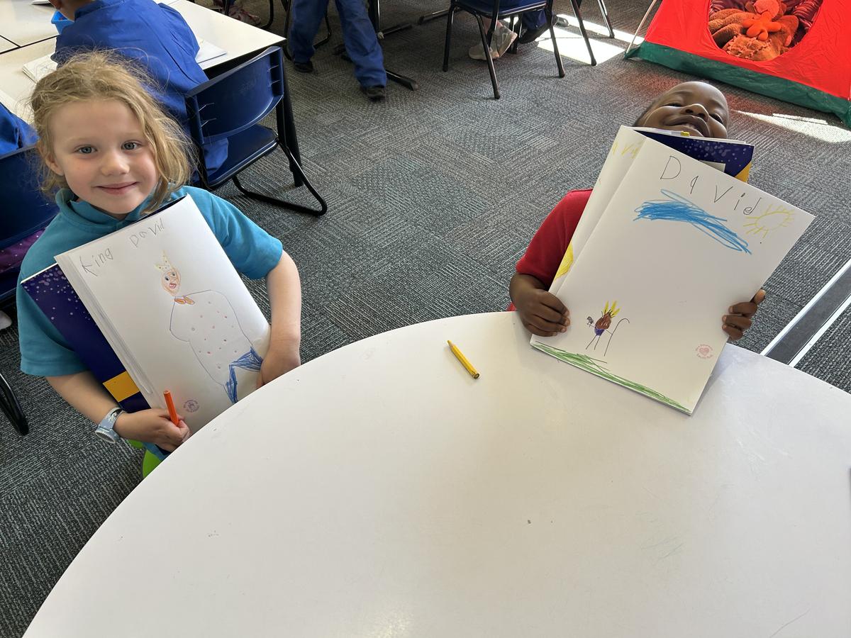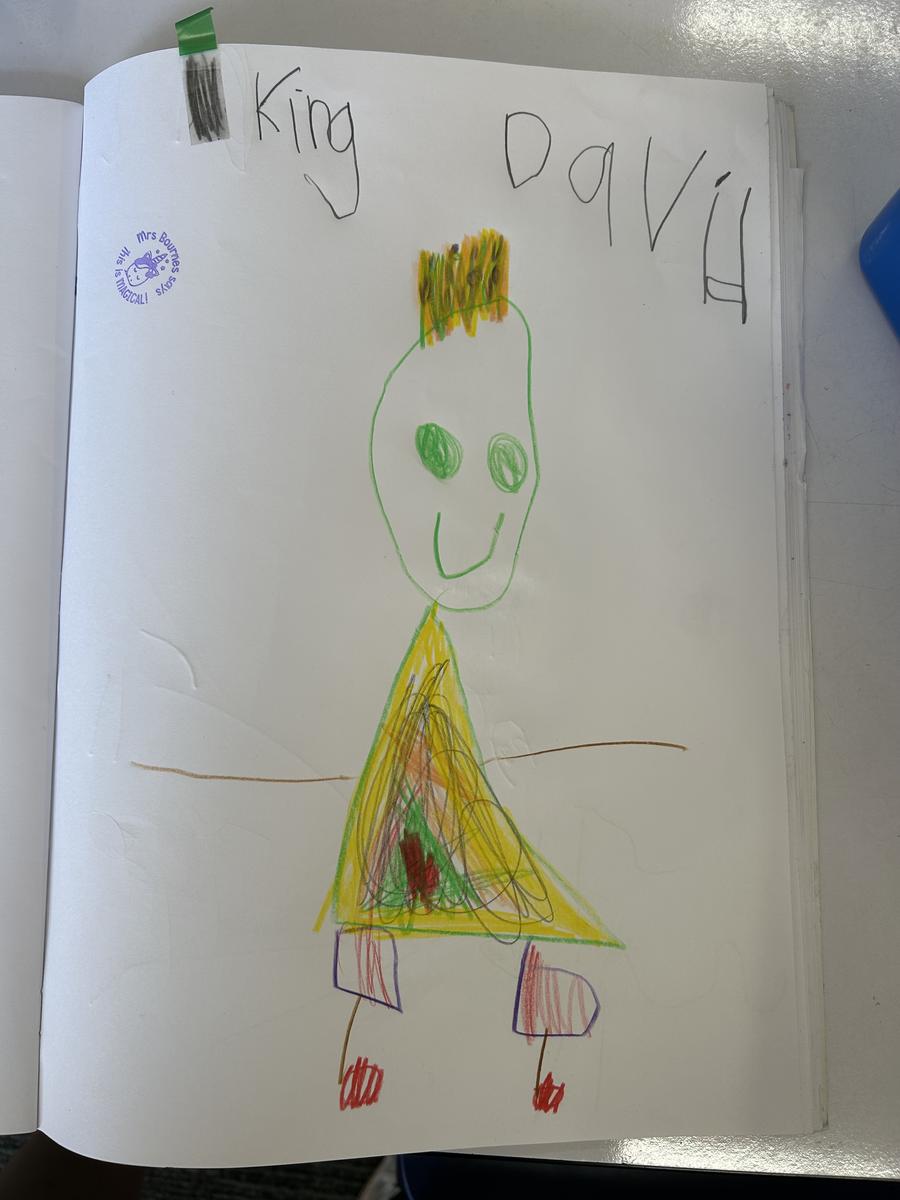 In Religion, Kindergarten have been learning about the stories of Moses' birth and King David from the Old Testament. They enjoyed retelling the story of Moses' birth using a storymap and cut out of baby Moses stuck to a paddlepop stick and hearing how David was brave enough to fight Goliath because he had God by his side to protect him. The children drew pictures of David as a shepherd (before he was annointed) and then as King of the Israelites.