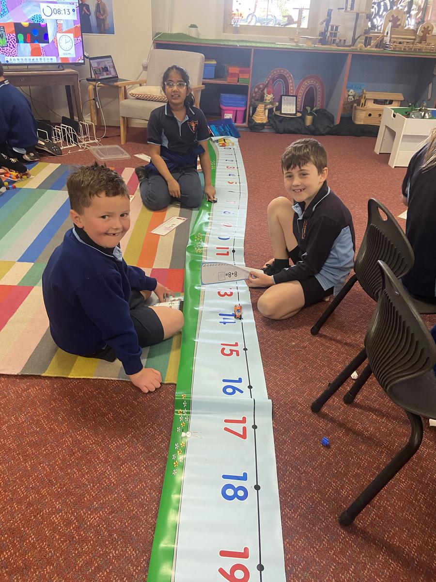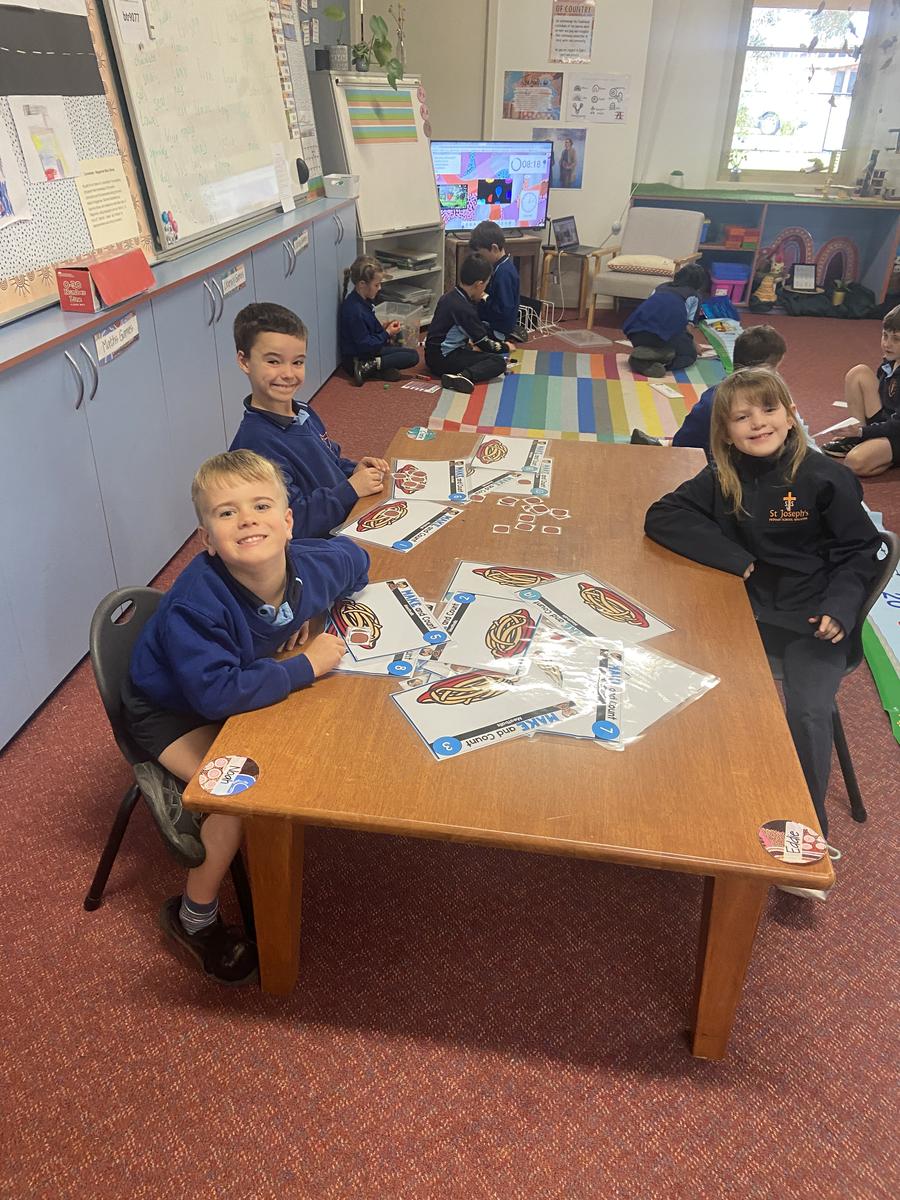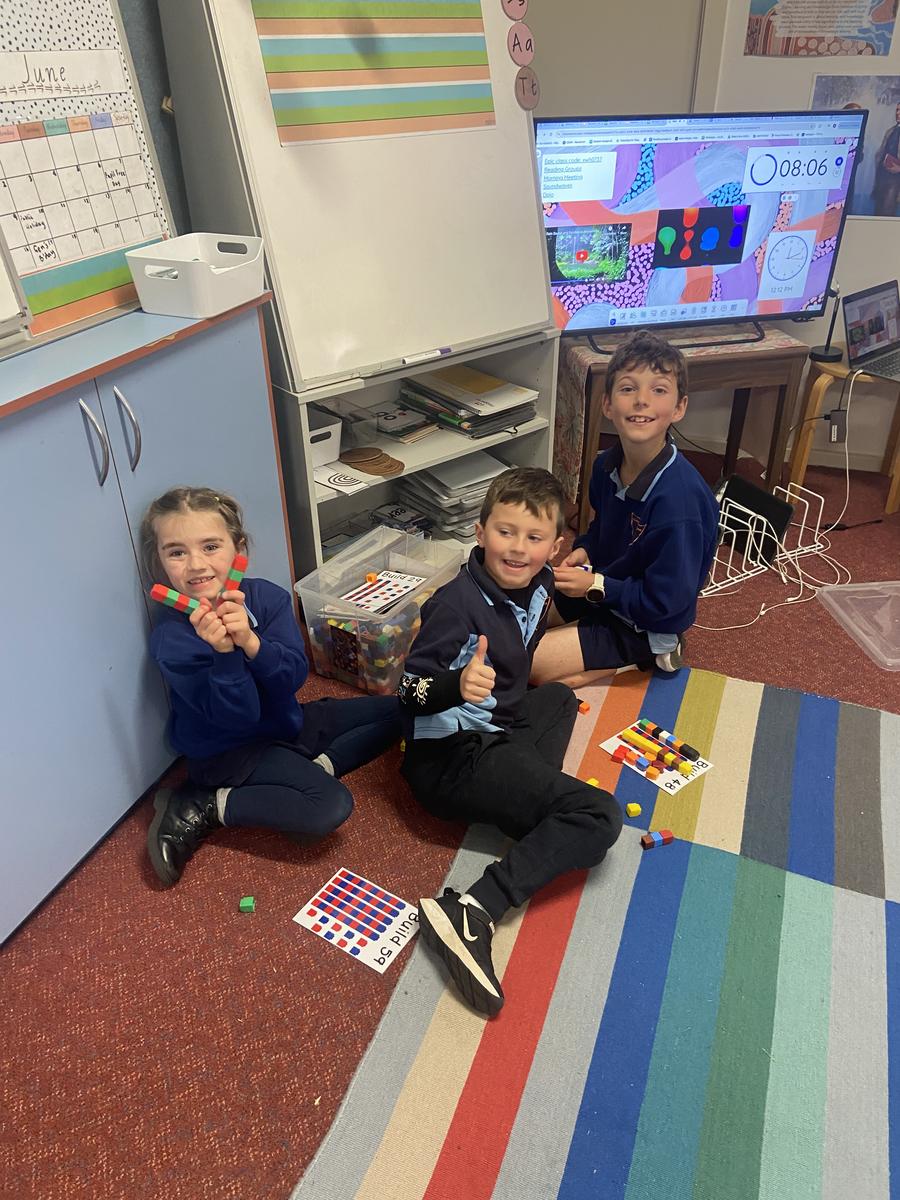 We have continued to revise our counting, making small collections, and matching numerals to amounts. We had a huge session of rotational activities when the 2/3 joined us on Thursday which included using a number line to help us solve equations, building with magnetic blocks, fraction puzzles, board games as well as number games on the iPads.