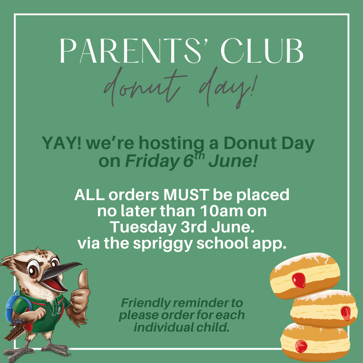 Parent's Club does, and we want to help you celebrate it with donuts for morning recess on Friday 6th June!
