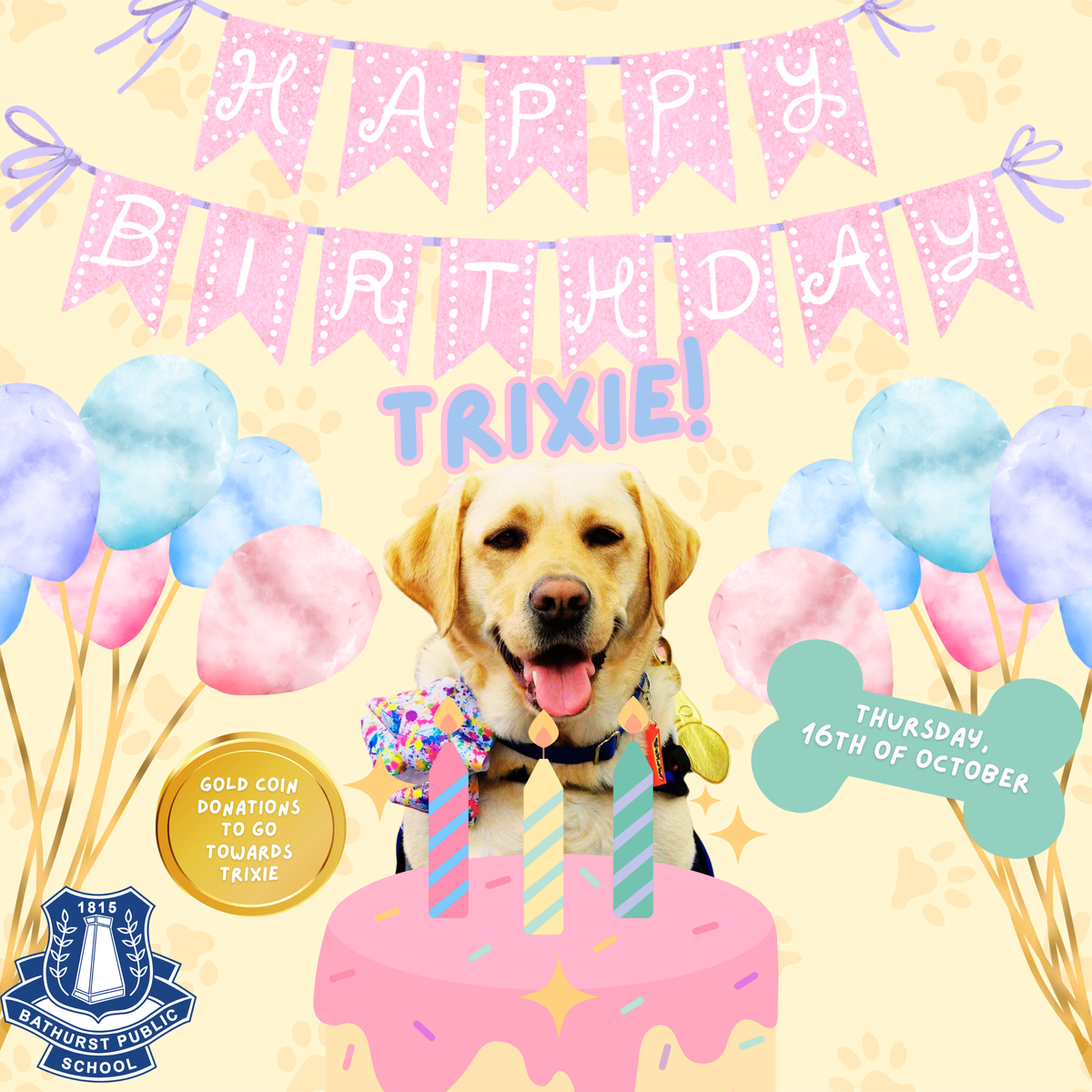 On Thursday 16th October, we will celebrate Trixie's birthday. On this day, we will all get to not only thank Trixie for the ongoing work she does at BPS, but wish her a Happy Birthday. We are asking all children to bring a gold coin to school to donate to "Trixie" so we can get her something super special to celebrate her 6th birthday.
