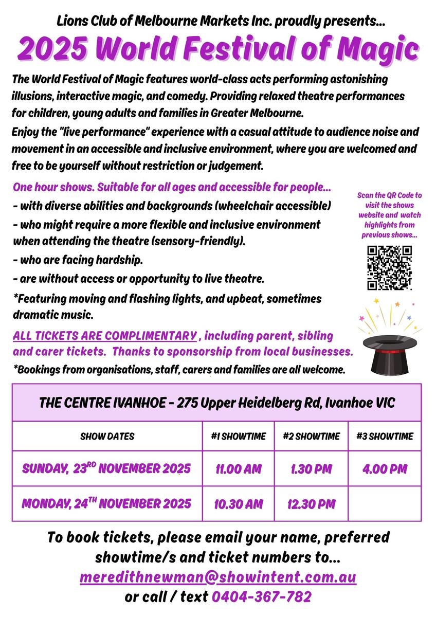 We are thrilled to invite Melbourne Schools and students and their families to attend our 2025 World Festival of Magic Shows at The Centre Ivanhoe on Sunday, 23rd and Monday, 24th November.