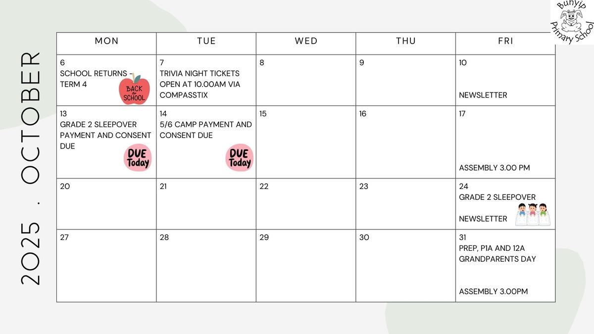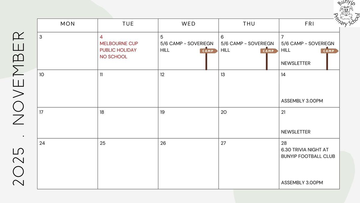 - Year 5/6 Camp: Wednesday 5th November - Friday 7th November