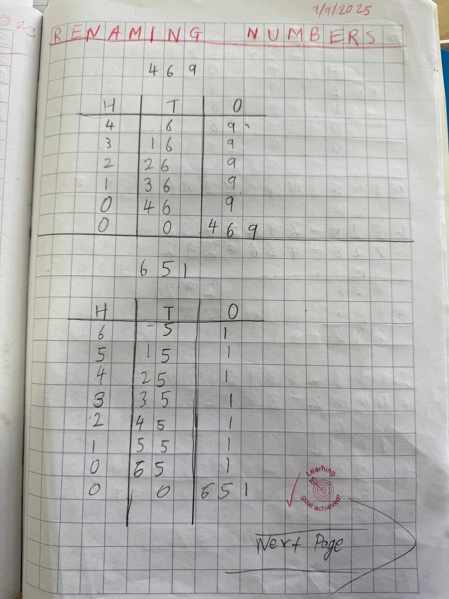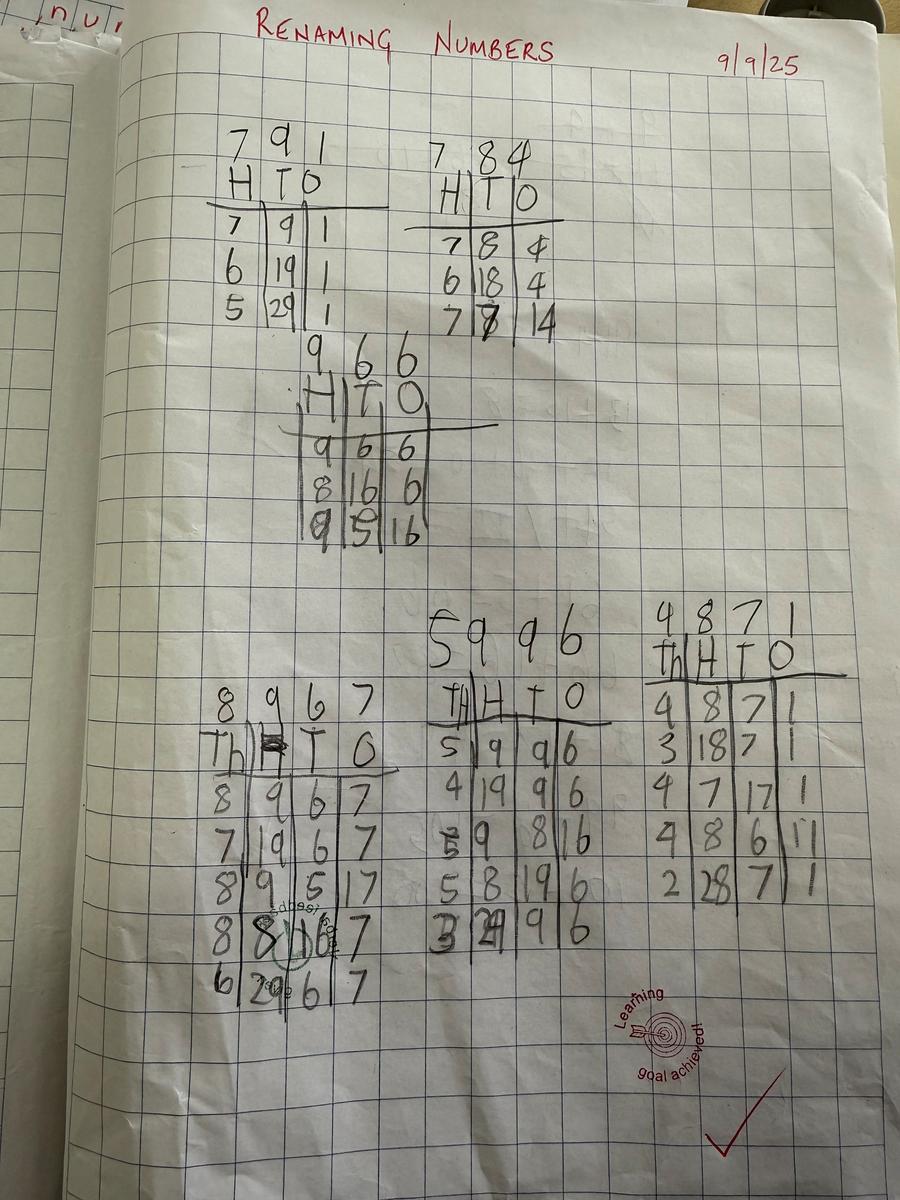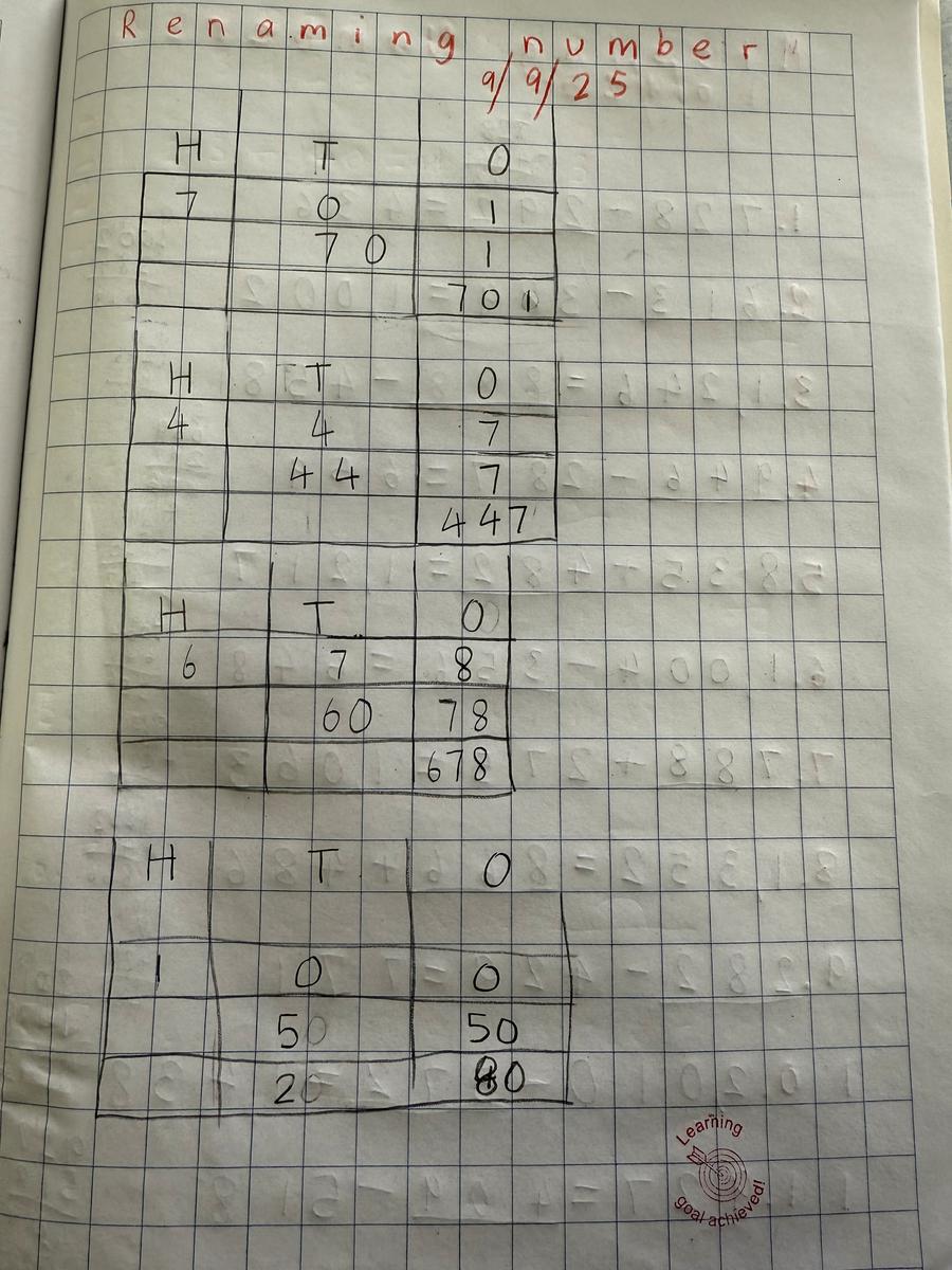 In Year 3 we have been working on Number Sense and Additive Thinking. Here are some examples of student work on Renaming Numbers in different ways. Renaming is when the number hasn’t changed, but the way we describe it has.