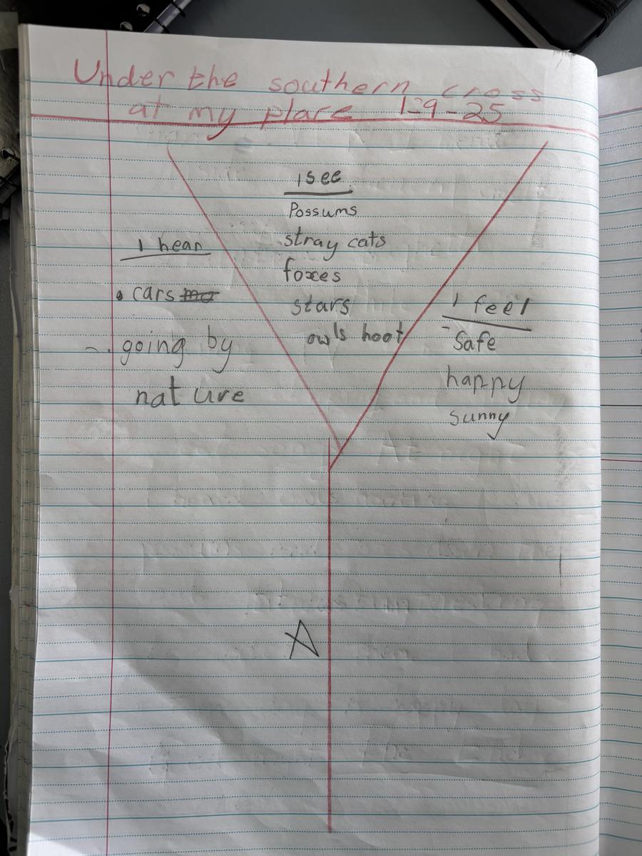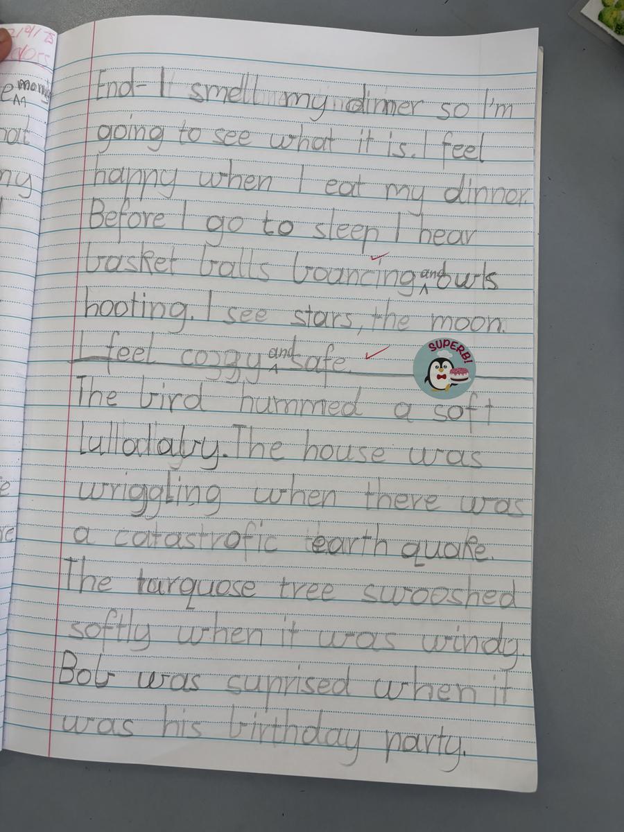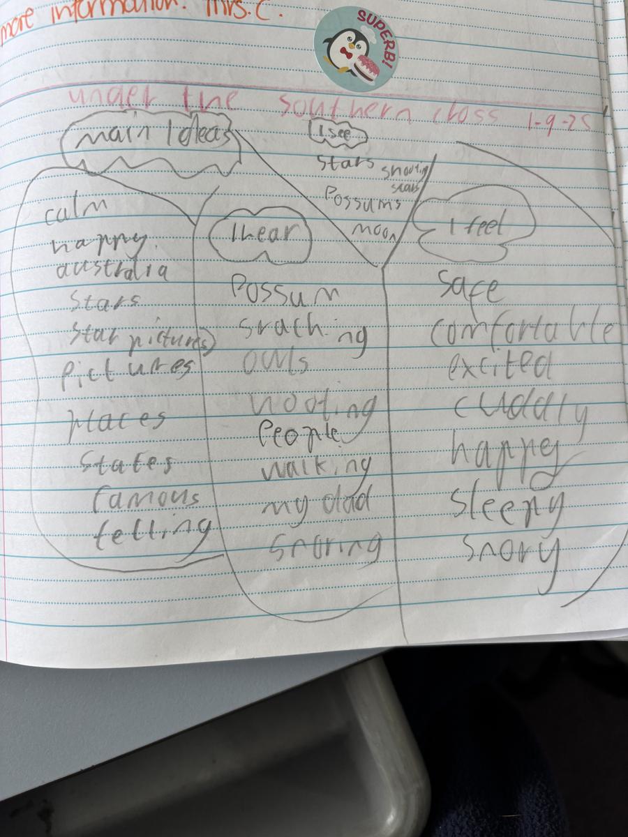 In Writing students have been learning about how to organise their ideas in their writing. They have continued to edit their writing for correct punctuation, including a capital letter at the start of a sentence and a full stop at the end. In class we have read 'Under the Southern Cross' and talked about what we hear, see and feel in the morning and evening. This included smelling and listening to breakfast being cooked in the morning and hearing possums and owls, while seeing stars come out at night.