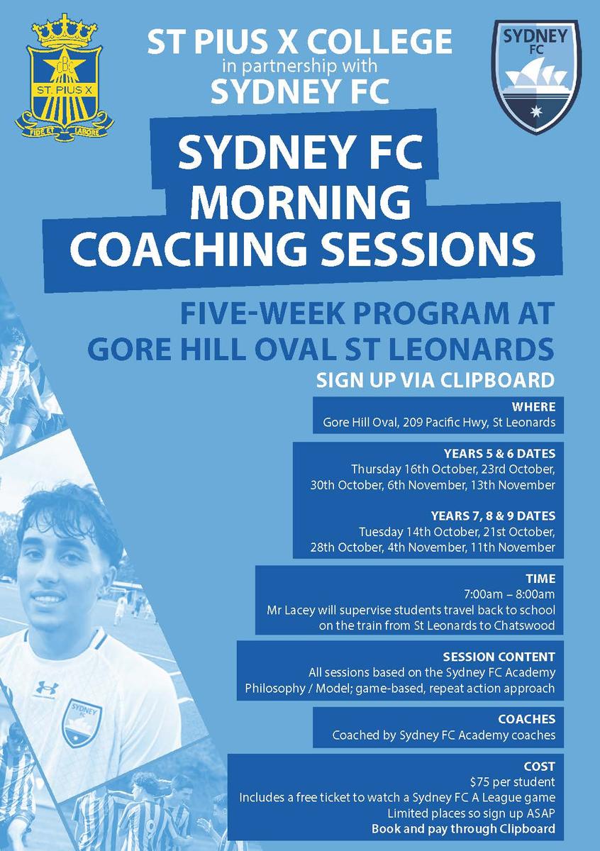 Train with Sydney FC Academy coaches at Gore Hill Oval (7:00 am – 8:00 am).