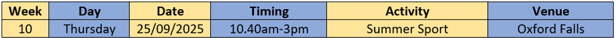 Week 2: 7 - 9 October Venues: Cammeray Oval & Macquarie Uni