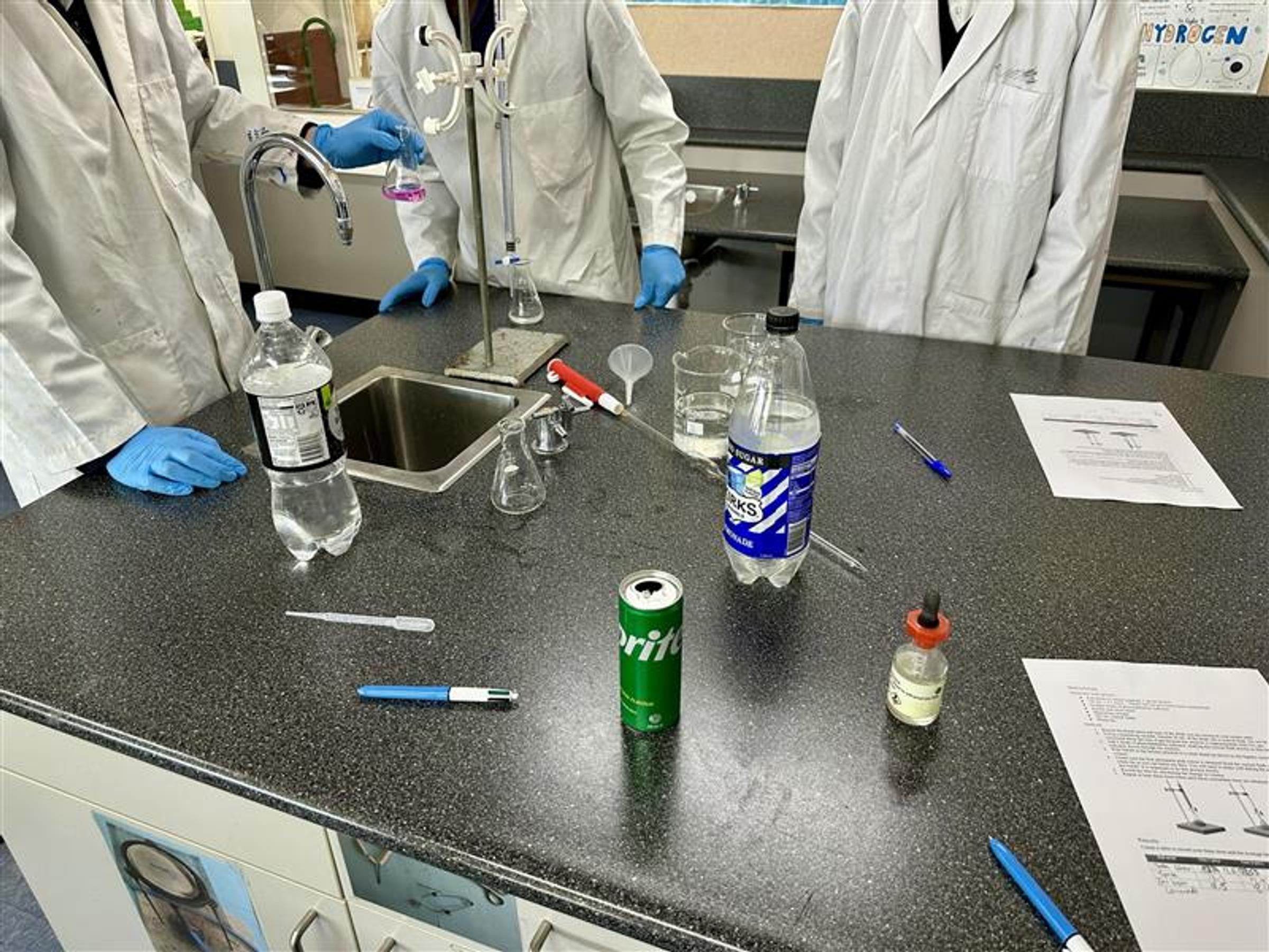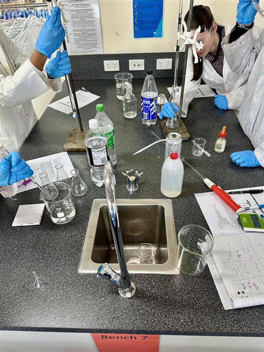 Year 11 Chemistry students completed their last experiment for this term. Carbon dioxide makes soft drinks fizzy and slightly acidic due to the formation of carbonic acid. This experiment used acid–base titration to measure the concentration of CO₂ in different soft drinks. Students will present their investigation and findings in a scientific poster.