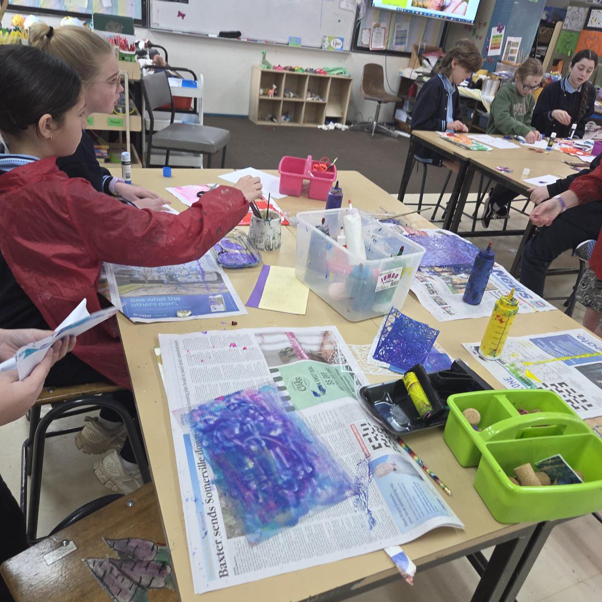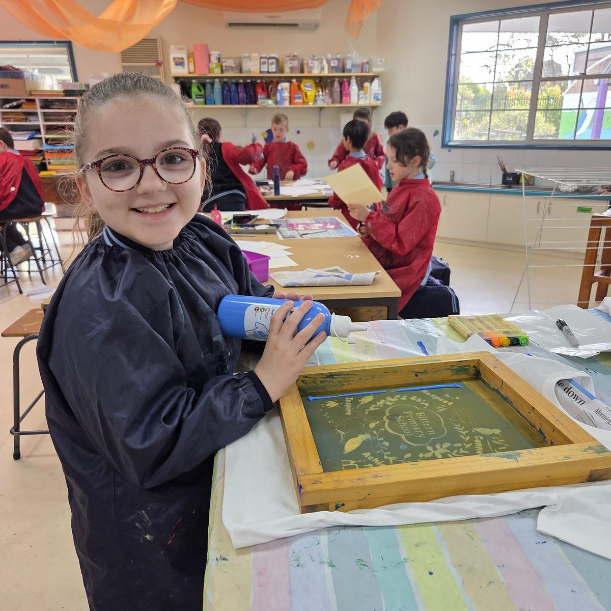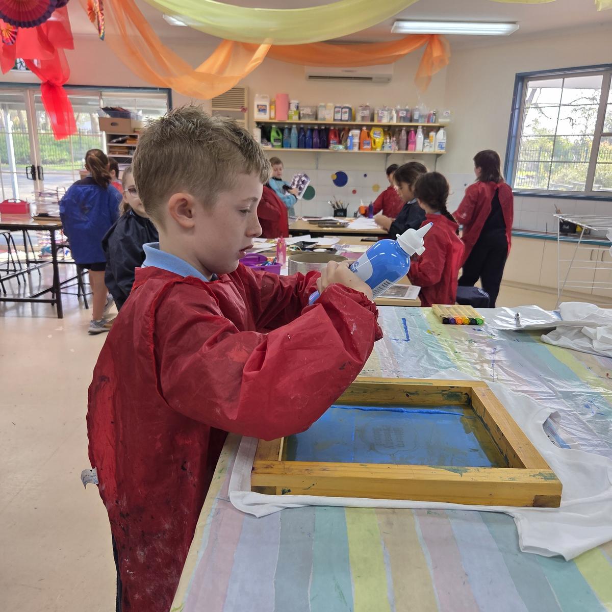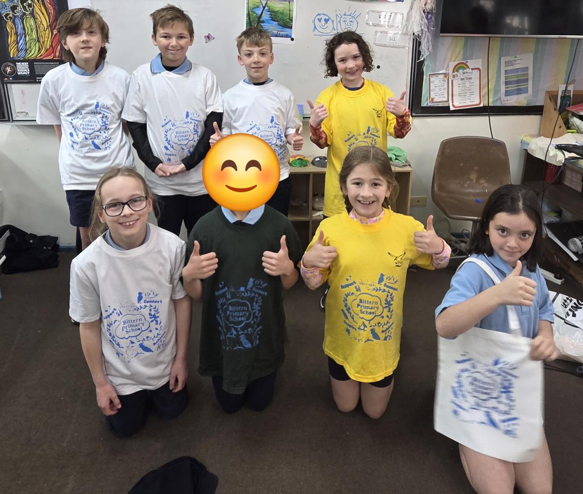 In Visual Arts this term, students have been busy exploring screen printing! Our focus was on Bittern Primary School’s updated values. Students discussed what each value meant to them and brainstormed how these could be represented visually. They then created drawings to express their ideas. The senior students worked together to digitise the drawings and arrange them into a balanced and visually effective composition. Once the screen was prepared, each student printed the design onto either a t-shirt or fabric, creating a unique and lasting piece of artwork.