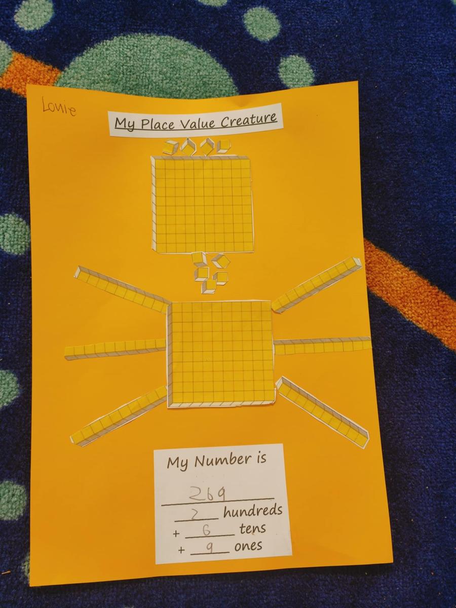 One of the highlights of our learning journey this term has been the creation of Place Value Creatures! 🐉 Using MAB pictures (Multibase Arithmetic Blocks), students have built their very own creatures with tens and ones. Some students created towering creatures with long “tens” for bodies and tiny “ones” for legs, while others crafted wild, wacky monsters with all sorts of place value features. It was a fun and hands-on way to bring numbers to life.
