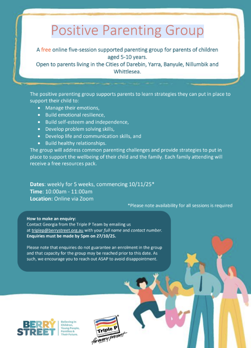 I have attached a flyer for an upcoming Positive Parenting Group program, which is available free to parents of children 5-10 years old living in the cities of Yarra, Darebin, Banyule, Nillumbik and Whittlesea.