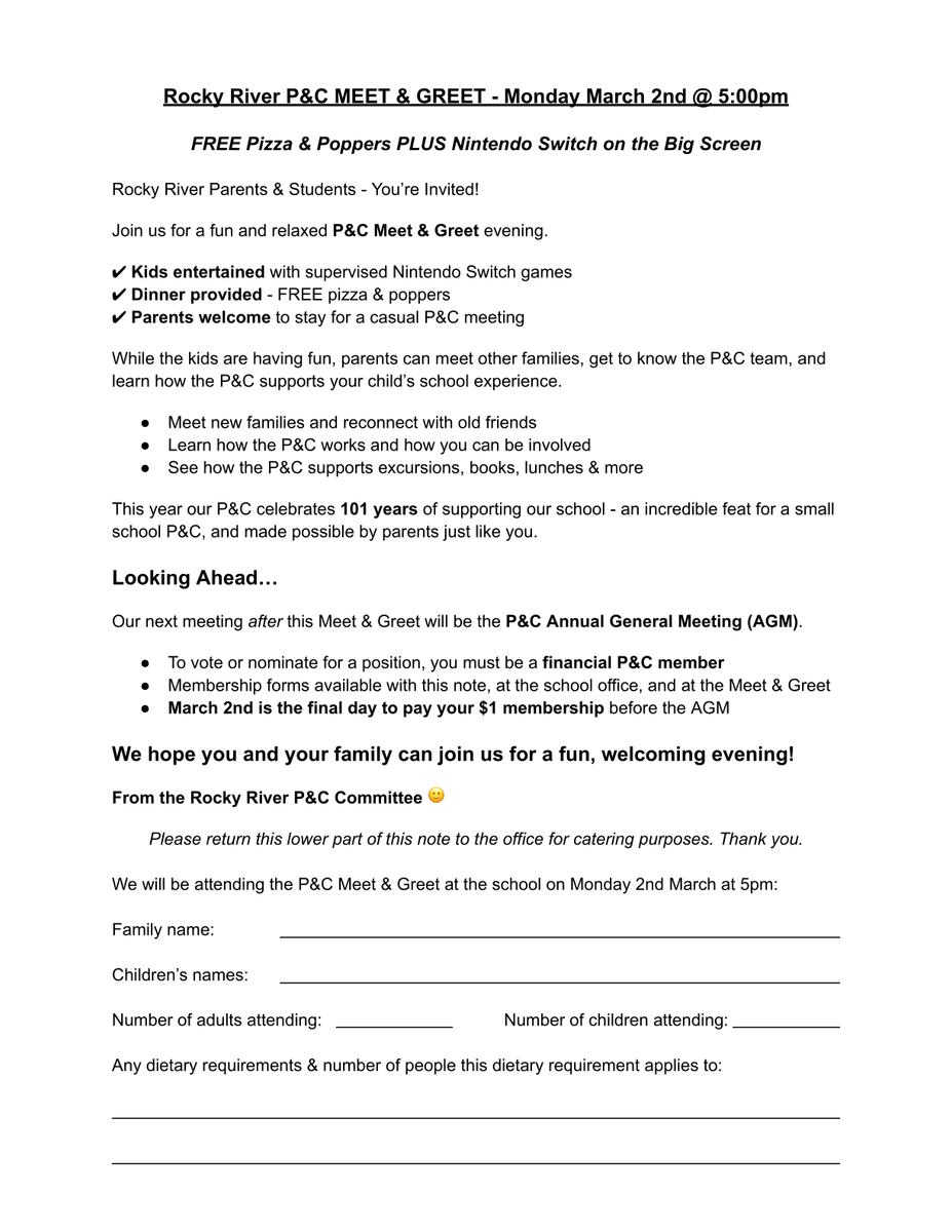 Our meetings are currently held on the first Monday of each month at 5pm at the school. Our next meeting will be our Meet & Greet event held on Monday 2nd March with free pizza's and poppers PLUS Nintendo on the big screen!!