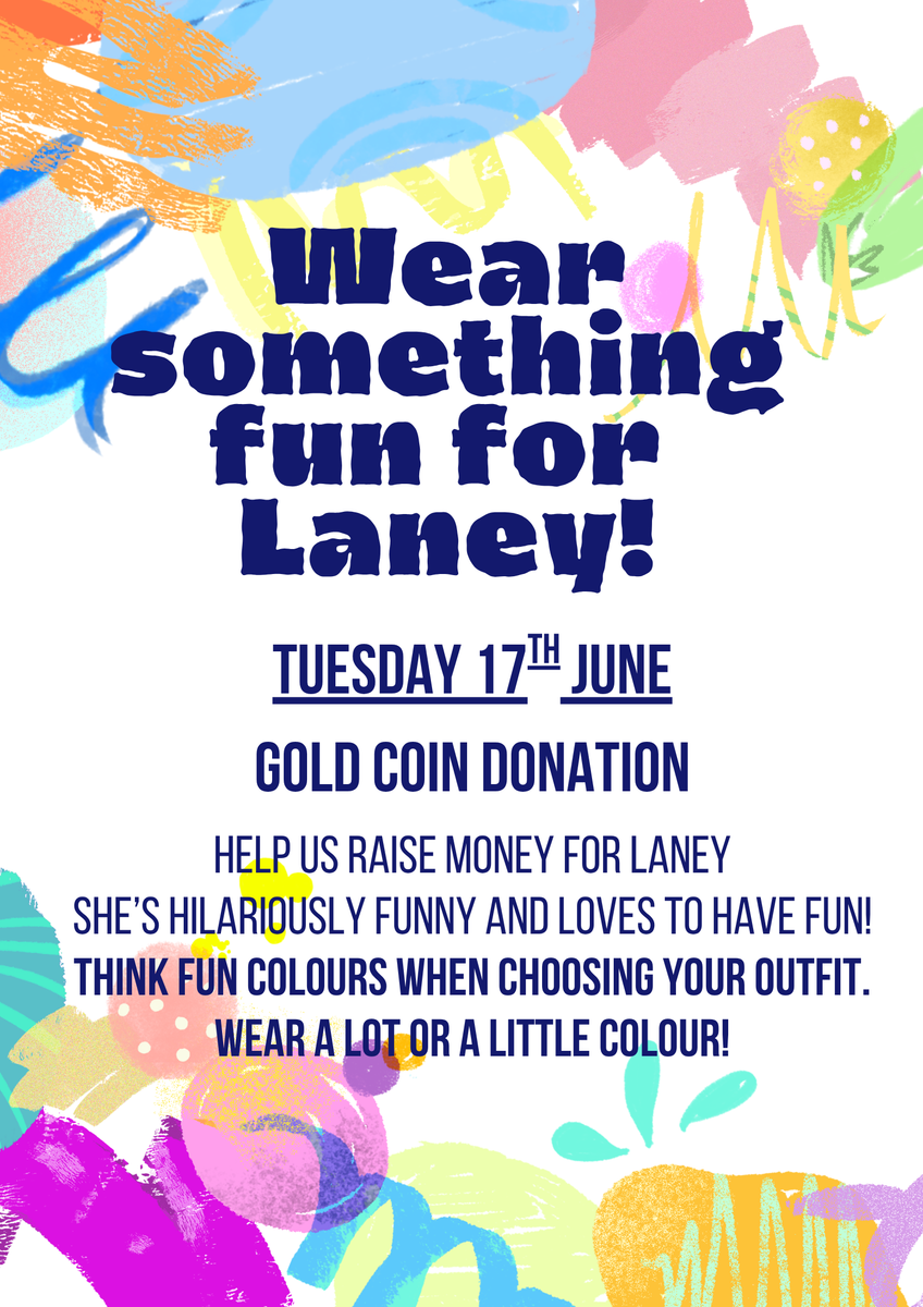 On Tuesday 17th June, we will be holding a fundraiser for Laney by encouraging children to wear "fun" clothes to school in exchange for a gold coin donation. FDC, along with Laney's siblings Neara and Boston, are aiming to raise enough money to buy Laney something special to help keep her occupied while in hospital receiving treatment and while at home resting. Children can come to school wearing as much or as little "fun" colours as they like!