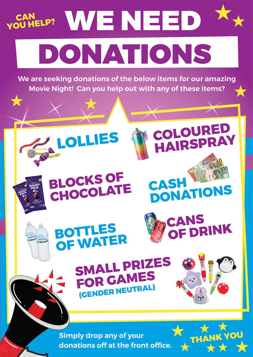 We are also now seeking donations for our Movie Night. If are you able to help out with any of the below items, please drop them off at the front office: