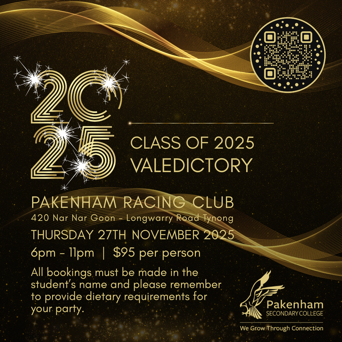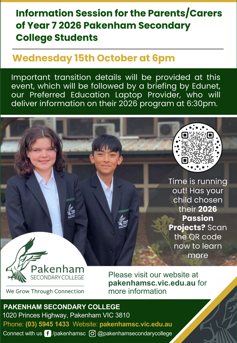 Tuesday 9th December is the State-wide Orientation Day for the 2026 Year 7 students. To make the transition as stress free for your child as possible, we will also have an extra Transition Day on Monday, 8th December. We understand that some primary schools may have events on this day, however, we do encourage students to attend. For further information, please visit our website at: pakenhamsc.vic.edu.au/transition