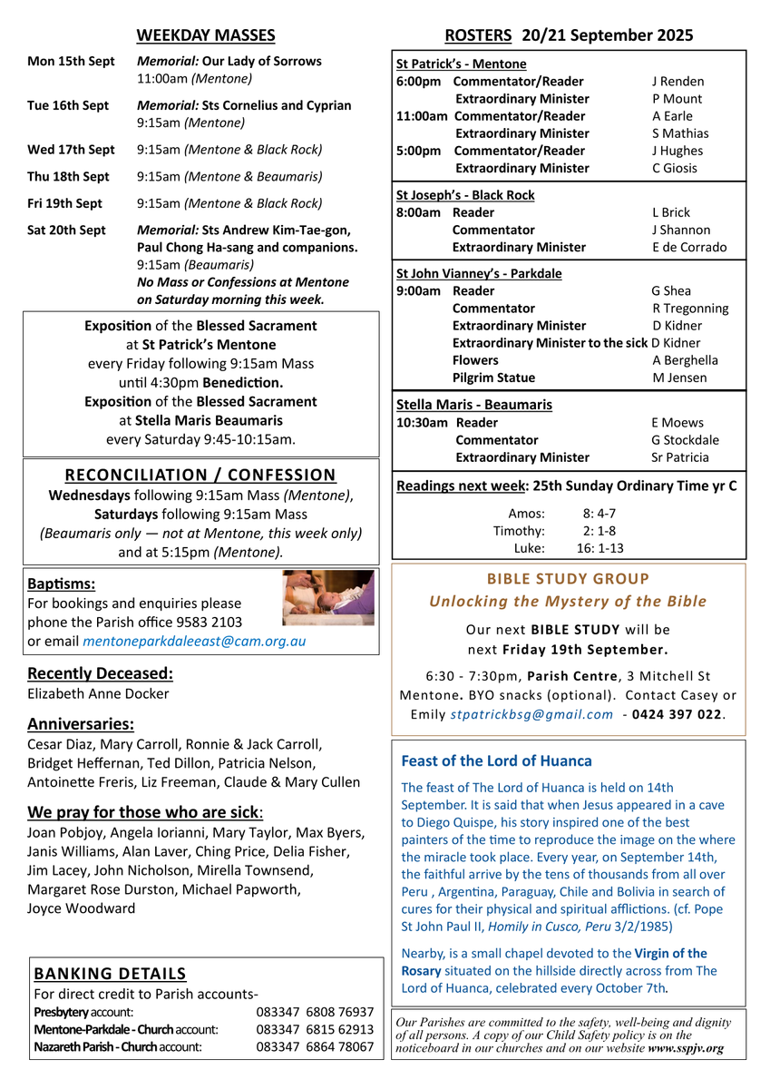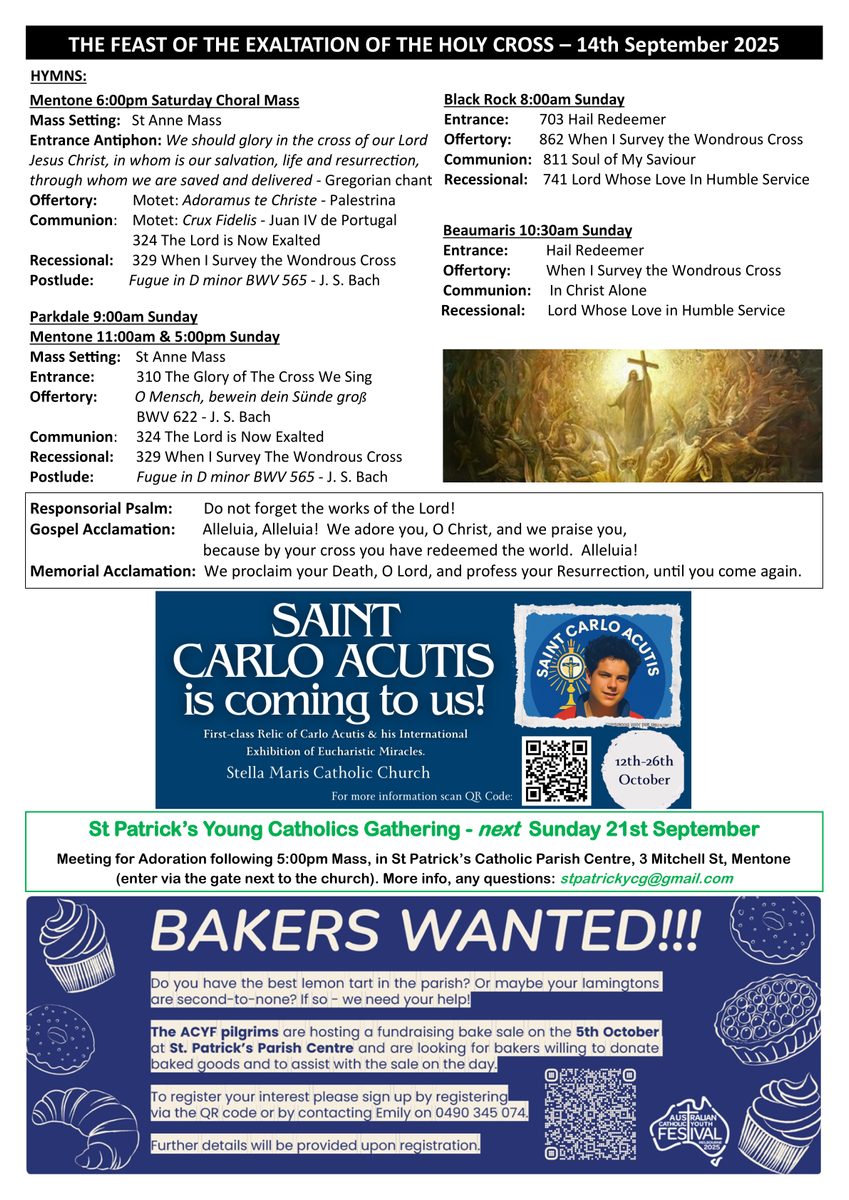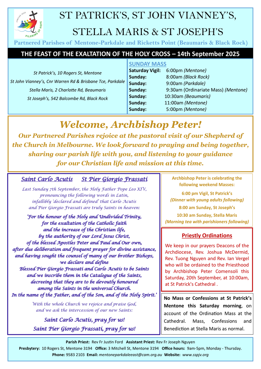 12:00 noon: Buffet lunch with parishioners from all our churches – St Patrick’s School Hall, 16 Childers St, Mentone.