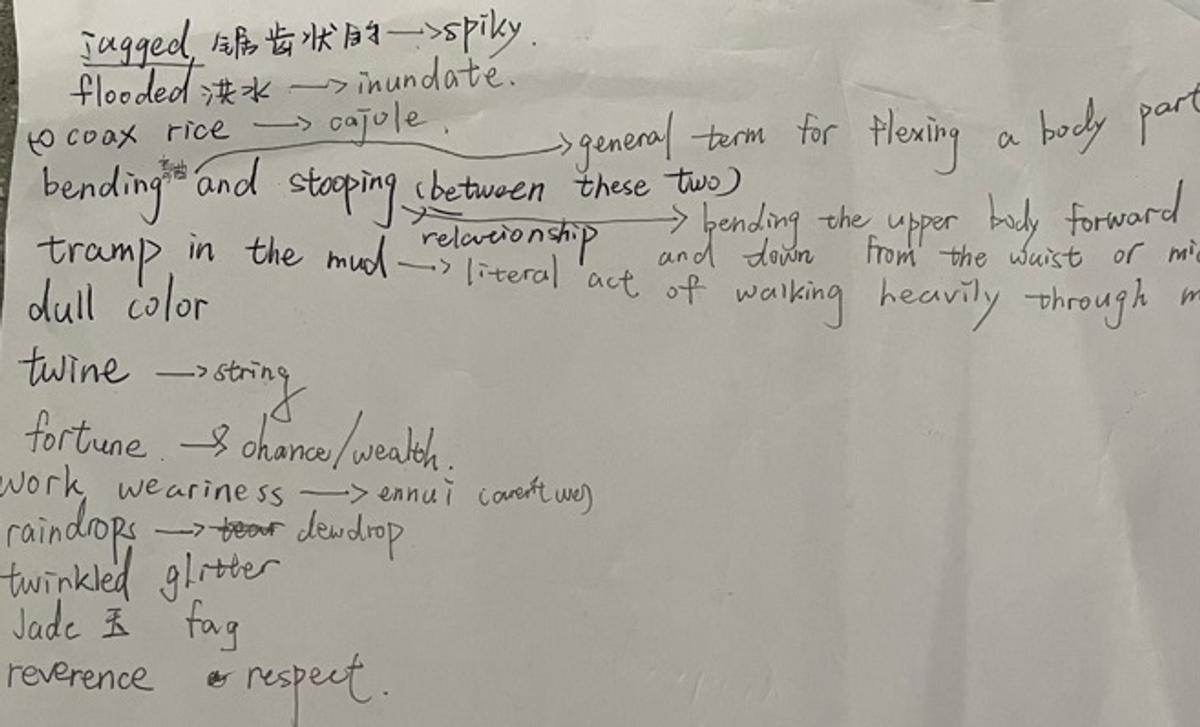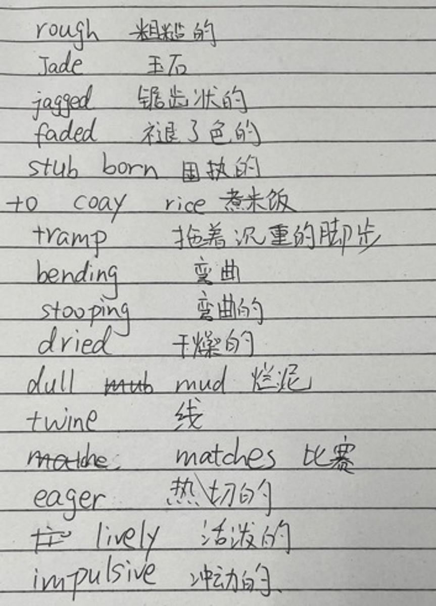 In the next session, the student brings the words meanings, use them in sentences, and recite them.