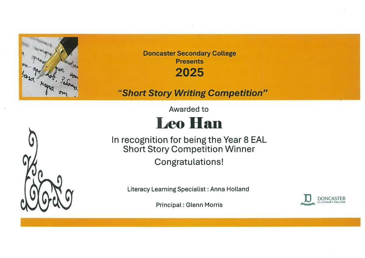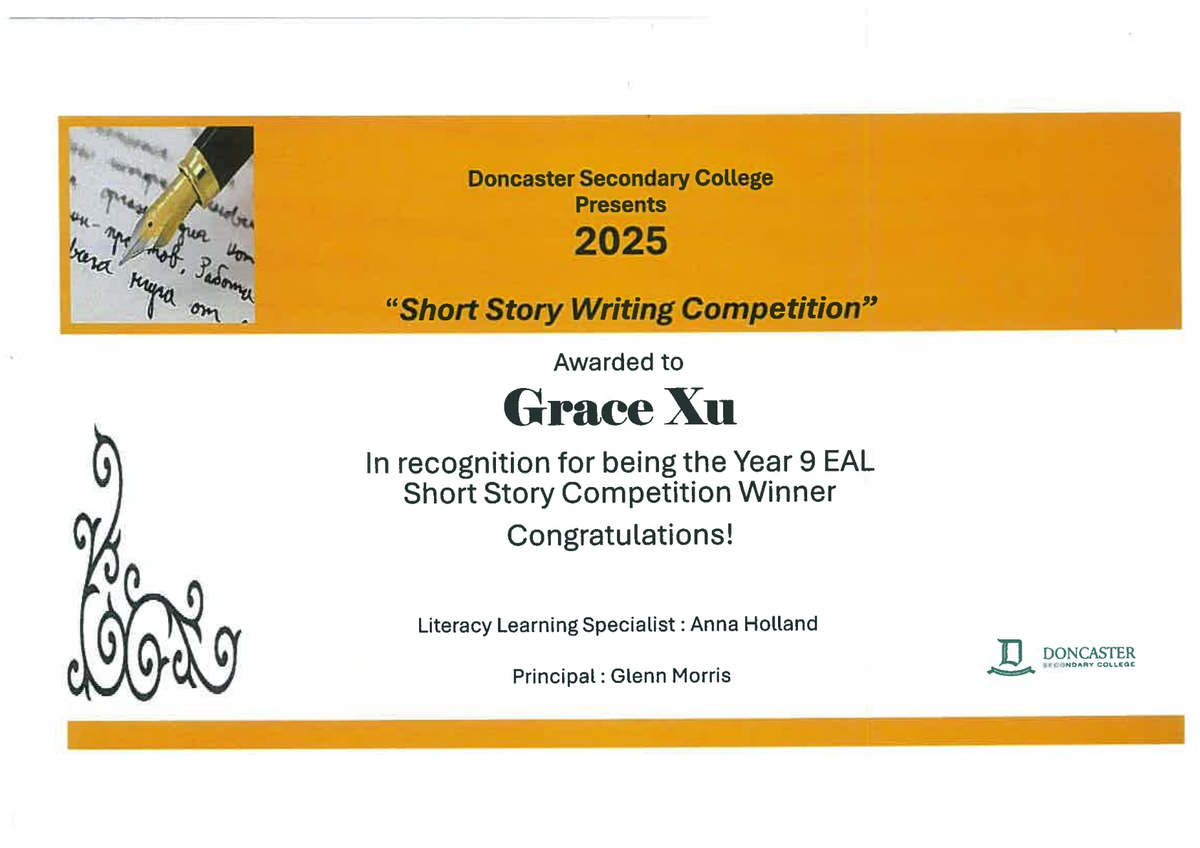 In the end, I won the Short Story Competition and received a certificate along with three books as prizes. Through this experience, I not only improved my learning and writing skills but, most importantly, I gained confidence from the constant encouragement of Ms. Huang and Mrs. Chiappa.