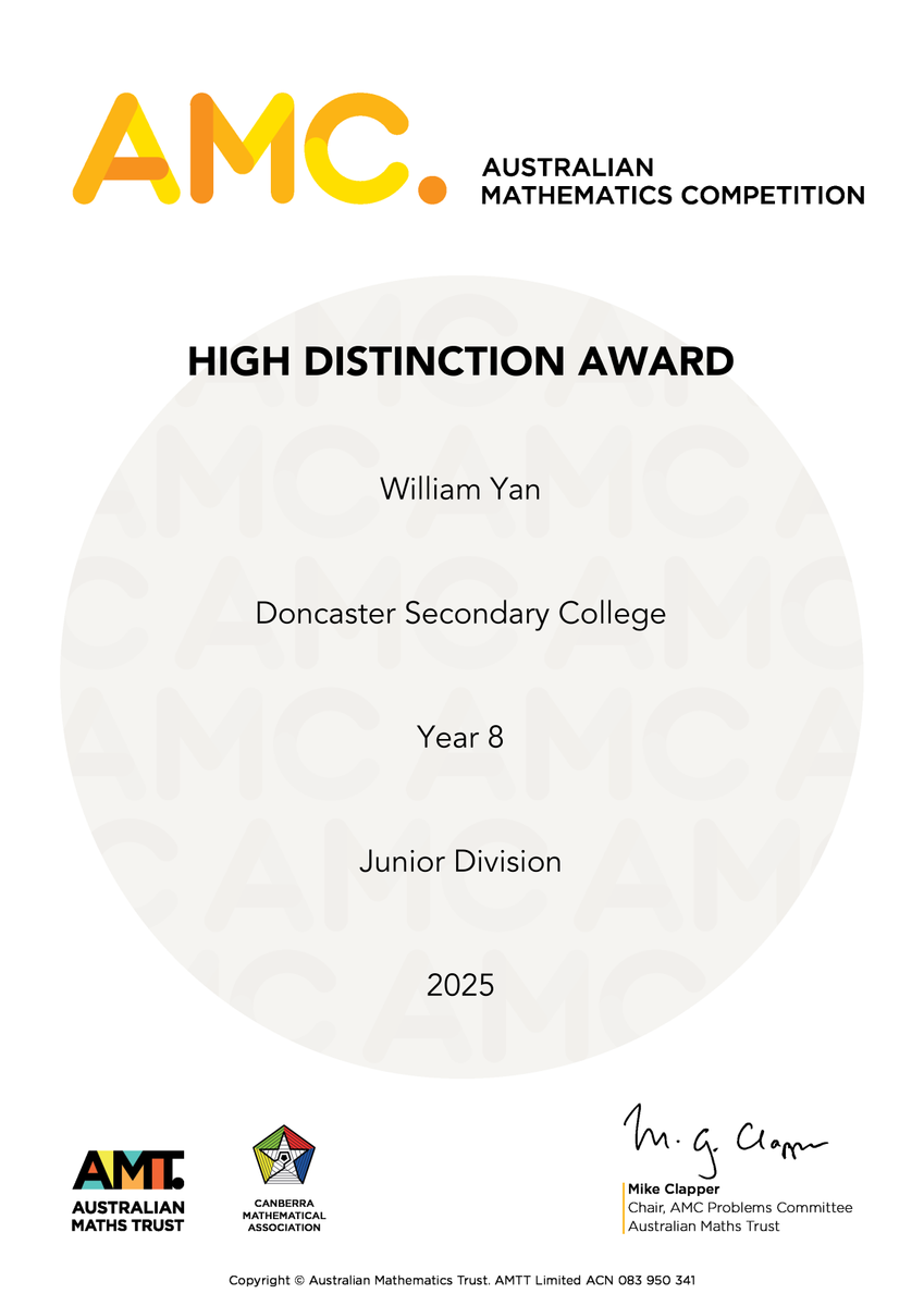 First held in 1978, the AMC is Australia’s longest-running, largest, and most prestigious mathematics competition for school students. Achieving a High Distinction places William and Leo among the very top performers nationally.