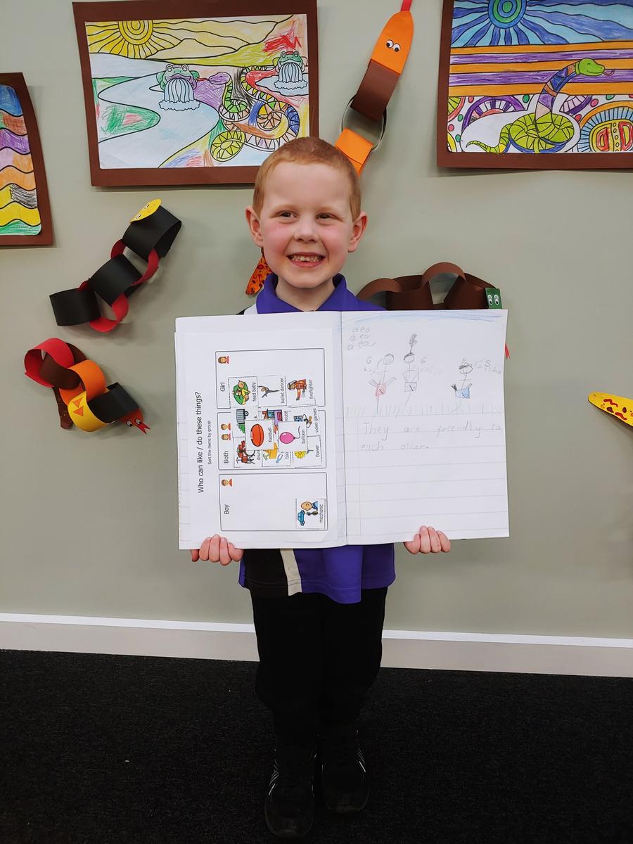 Picture of logan with his Sel book showing his understanding of healthy friendships.