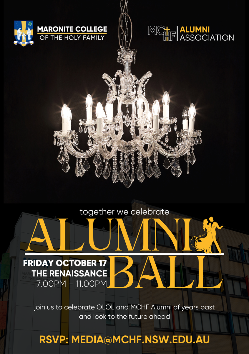 Our final big event for the year is our Alumni Ball to be held on 17 October at 7 pm at the Renaissance. More information to follow, but the invitation is open to all past students and teachers of the Our Lady of Lebanon College and Maronite College of the Holy Family.