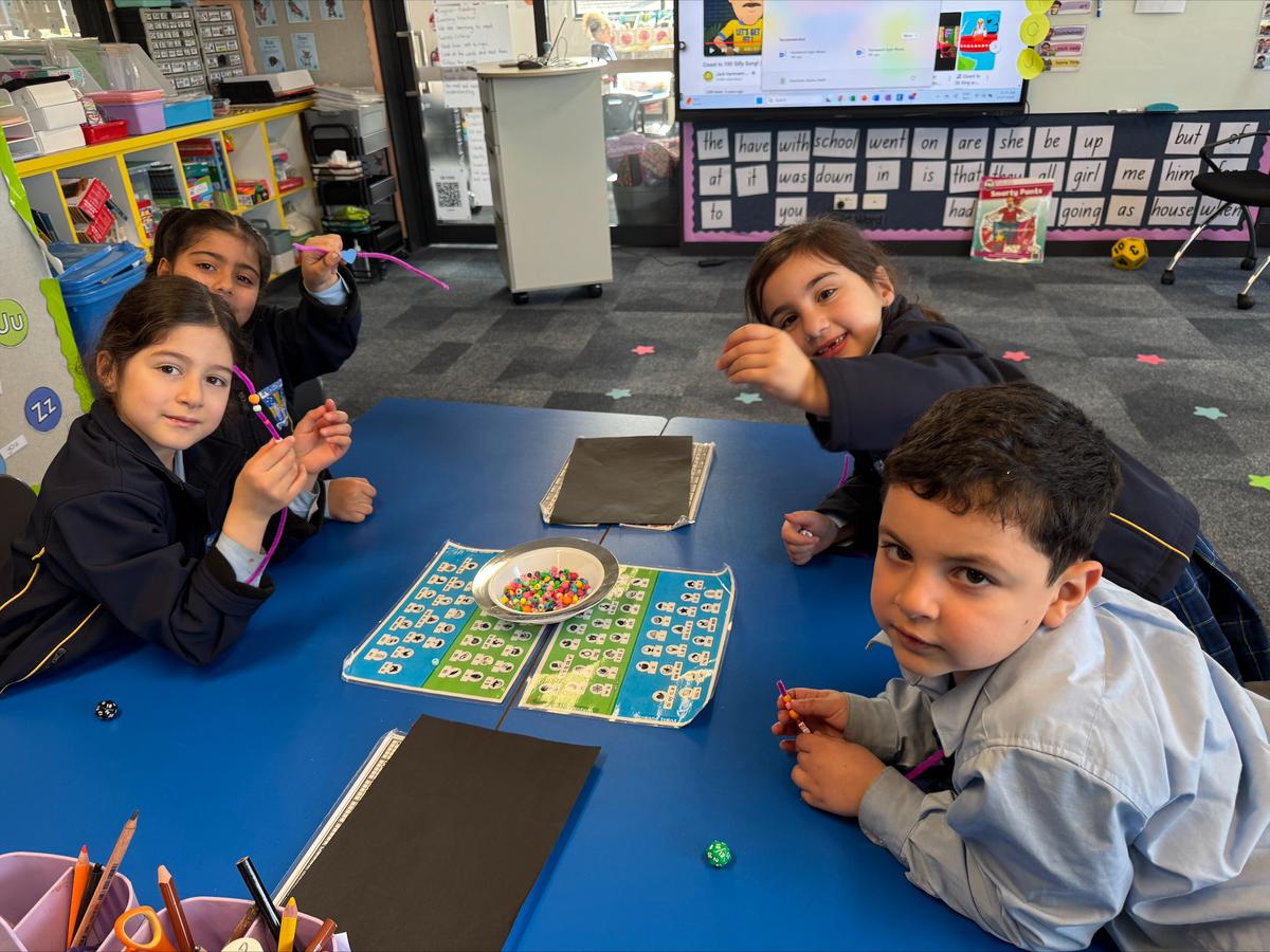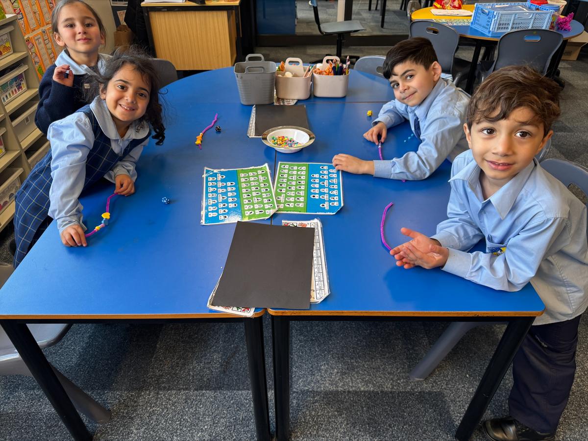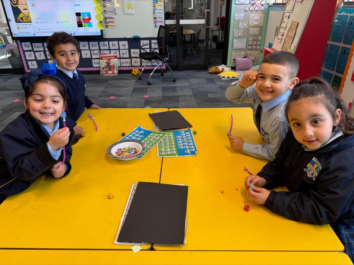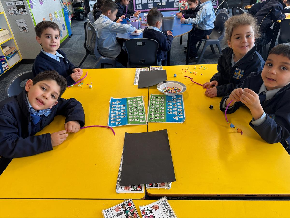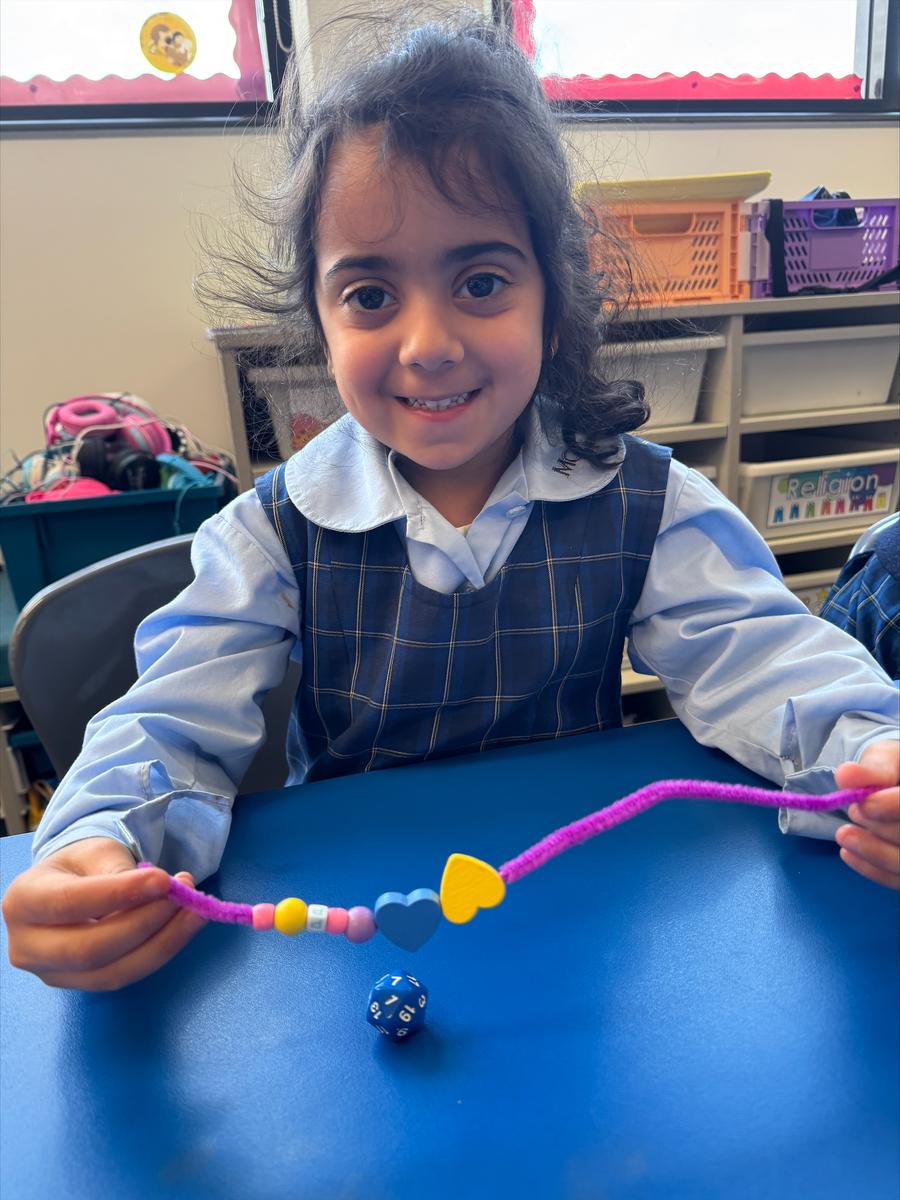 On the 25th of July, Kindy Red continued developing their counting skills through a hands-on and engaging maths activity. Using a 20-face numbered dice, each child identified the number it landed on, then threaded that many beads on their pipe cleaner.