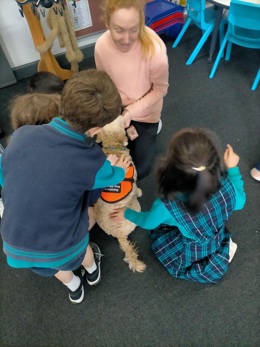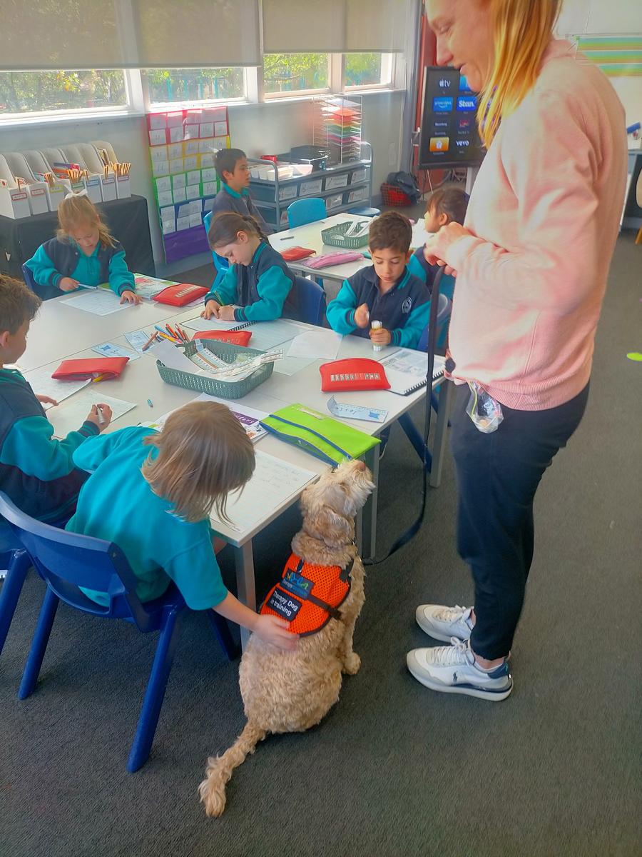 Today was a very exciting day, because Ginger successfully passed the first stage of her therapy dog assessment! During the assessment visit, she confidently explored classrooms, followed commands, wasn't distracted by food on the floor or desk, and even remained calm with lots of noise and activity. A big thank you to everyone for showing respect and kindness to Ginger as she continues her learning journey here at Old Orchard. After the busy and successful day of testing, Ginger is now enjoying a well-deserved sleep!