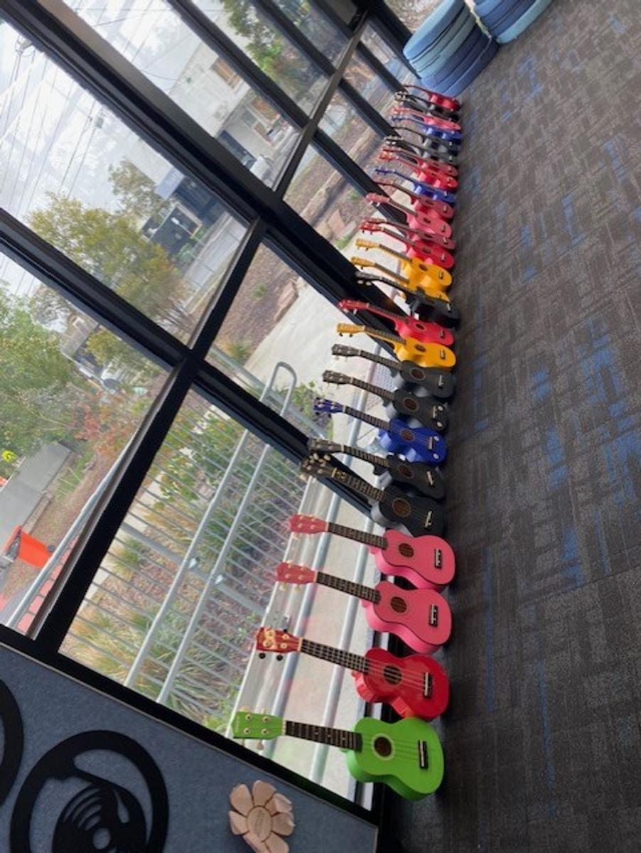 They learnt how to correctly hold a ukulele, how they are tuned, how to pick the strings and how to strum the strings and did so to a number of music tracks.