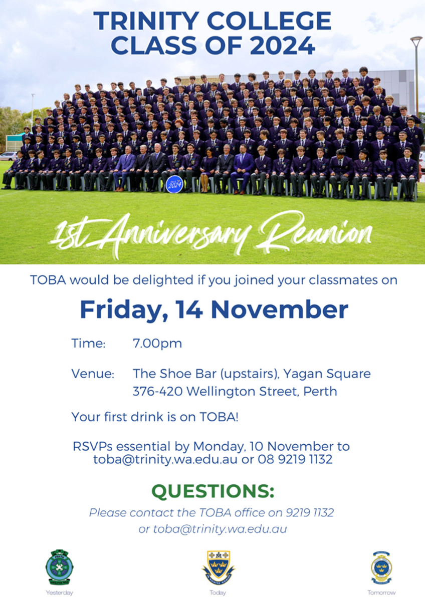 If you have any questions, please don't hesitate to contact Vanessa in the TOBA office at 9219 1132 or toba@trinity.wa.edu.au