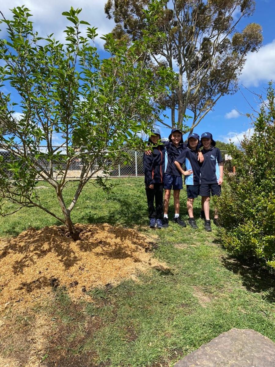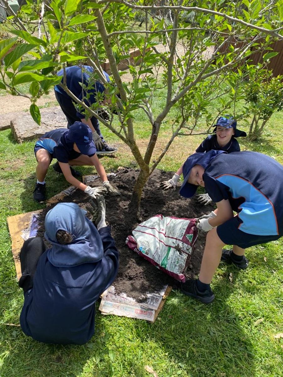 The Grade 4s created a no-dig garden under the mulberry tree so that we can plant some flowers and vegetables there soon.