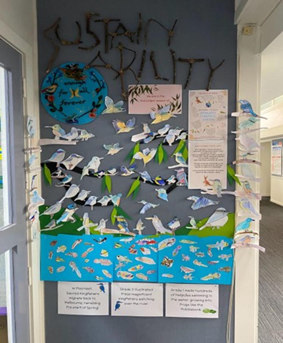 Grade 3 and Grade 1 made a beautiful display showcasing their talents as illustrators. This depicts the return of the Kingfishers and the flourishing of tadpoles as they grow into frogs. We learned that frogs need to lay so many eggs in their frogspawn because many other creatures find tadpoles delicious!