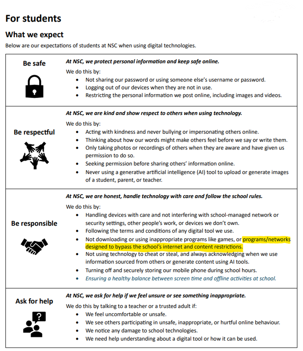 We are finding more students coming to school with VPN's installed. A VPN is quite a serious breach of our ICT policy as it does bypass our school filters. Families are encouraged to speak with their children about this to ensure that they are abiding by the digital agreement they signed. If you have any questions feel free to get in contact with your childs coordinator or head of year level.