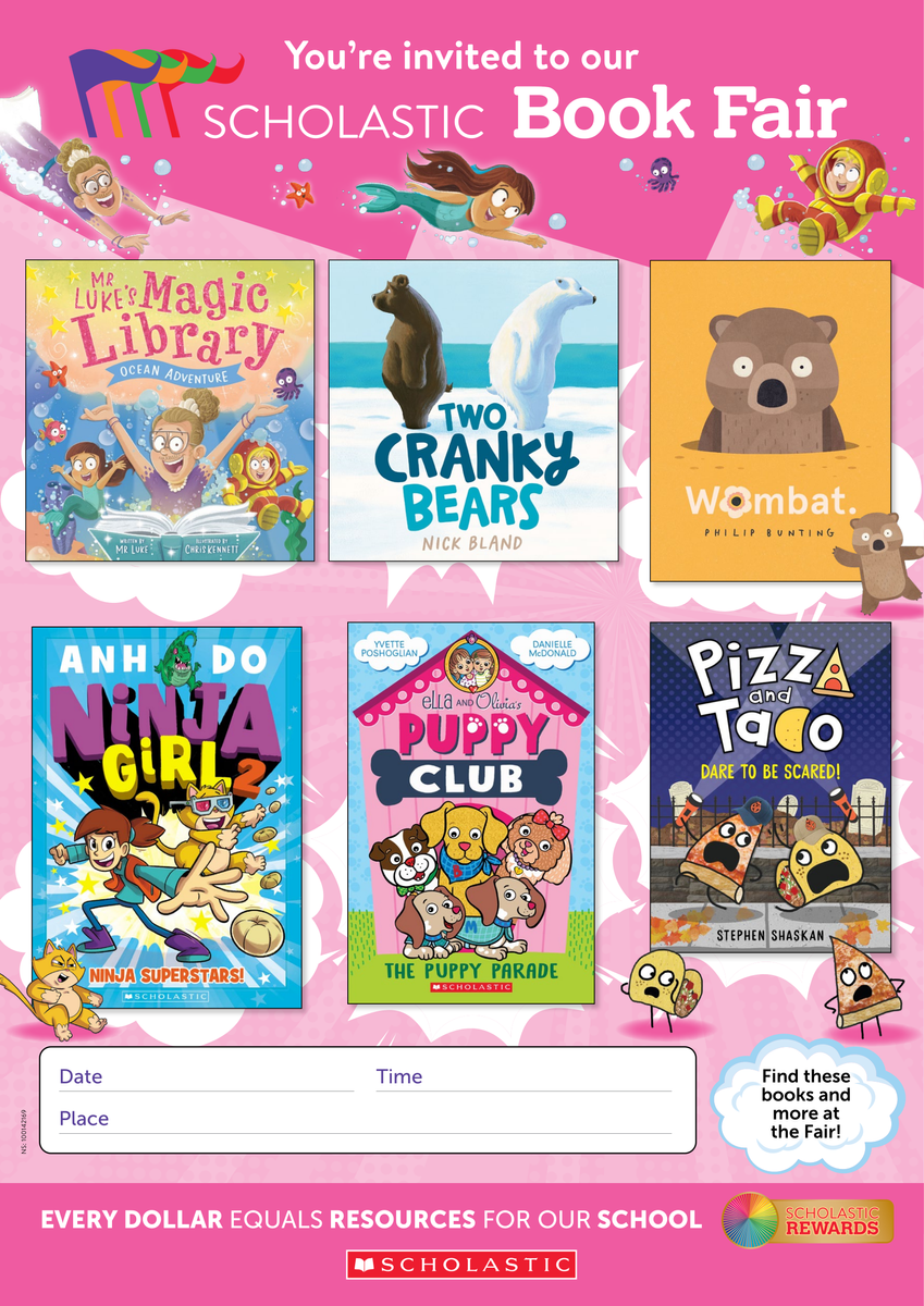 Opening times will be 8:30 - 9:00am and 3:15 - 3:45pm. Bus travellers will have the opportuntiy to visit the fair during the day. Our Book Fair always generates much interest and a percentage of sales goes towards the purchasing of new books for the school. Looking forward to seeing you there!