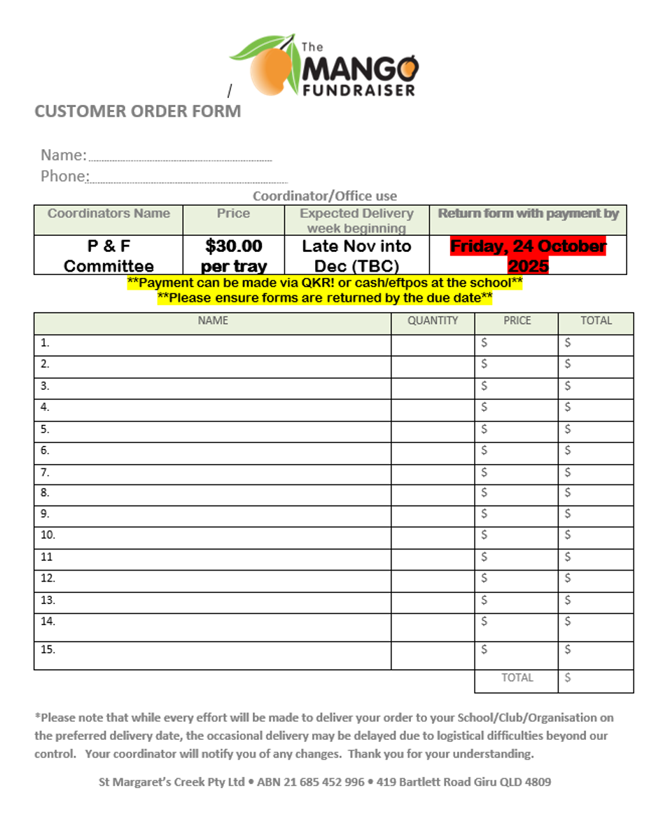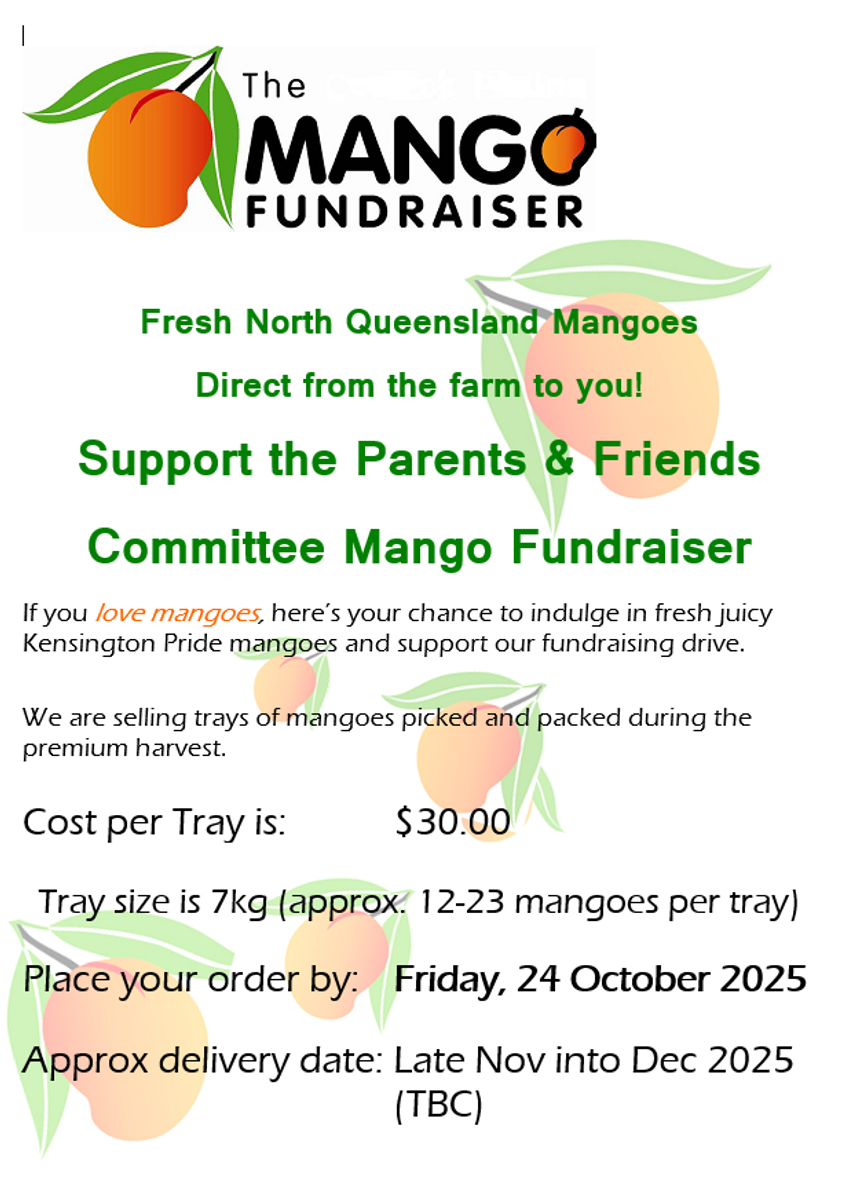 Parents & Friends are running a Mango Drive. All students received a form yesterday and they are available at the office.