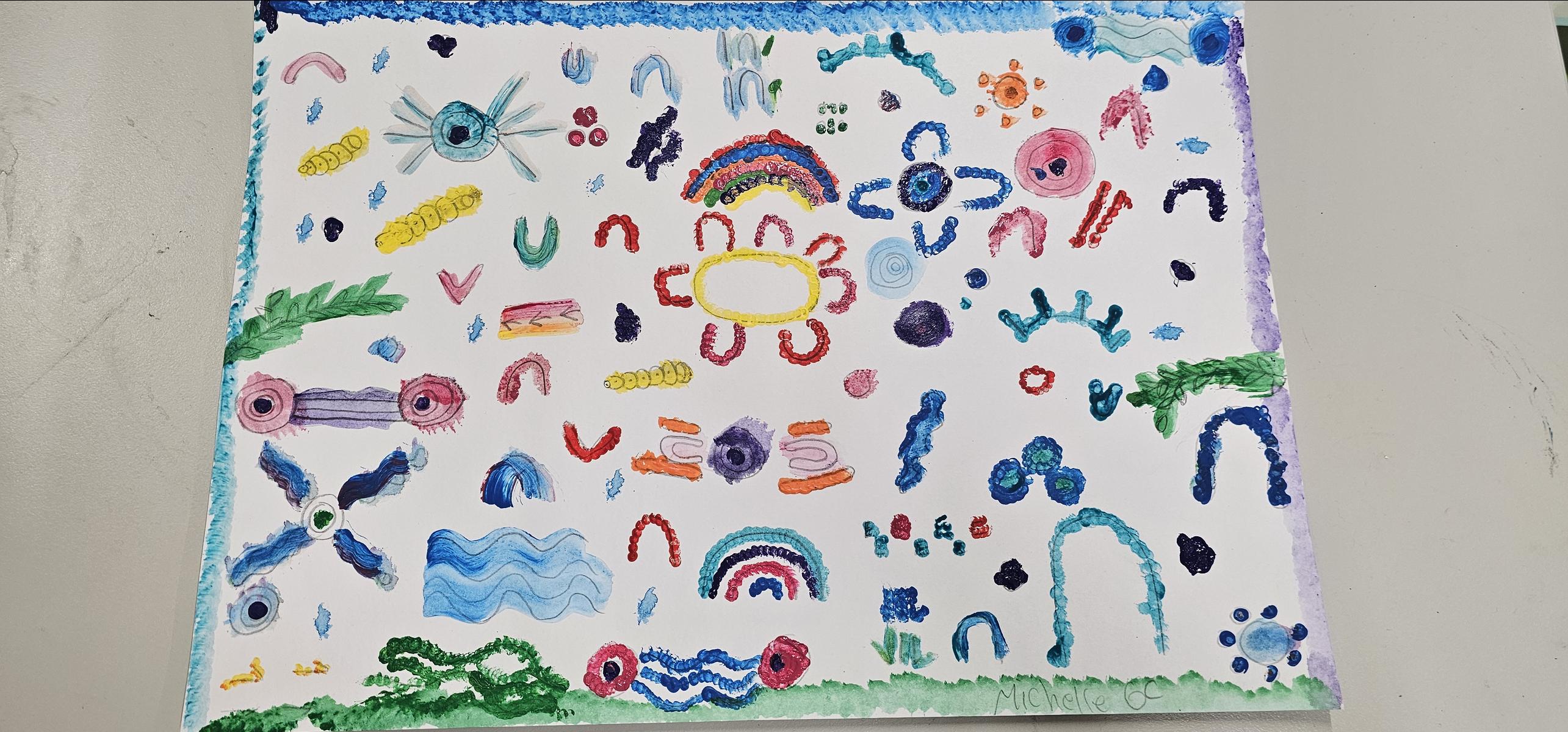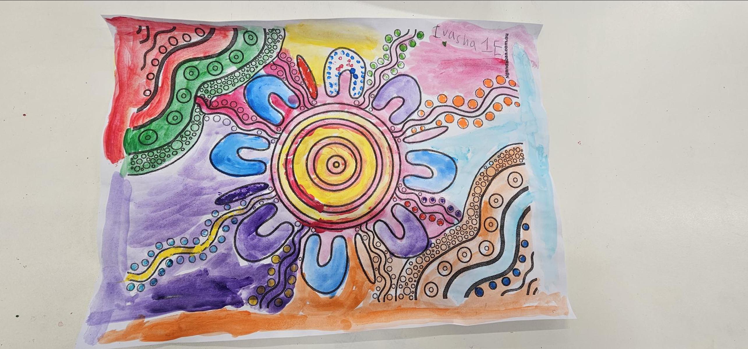 Learners applied Indigenous dot painting techniques and shared tradition Indigenous symbols to the design and complete their own individual community paintings. These captured the important and individual spirit of each students world, their families, friends, parks and places special in their lives.