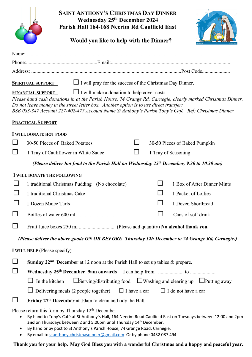 2024 will be the 32nd year of St Anthony’s Christmas Dinner and more than ever we ask you to reach out to those who need our help.